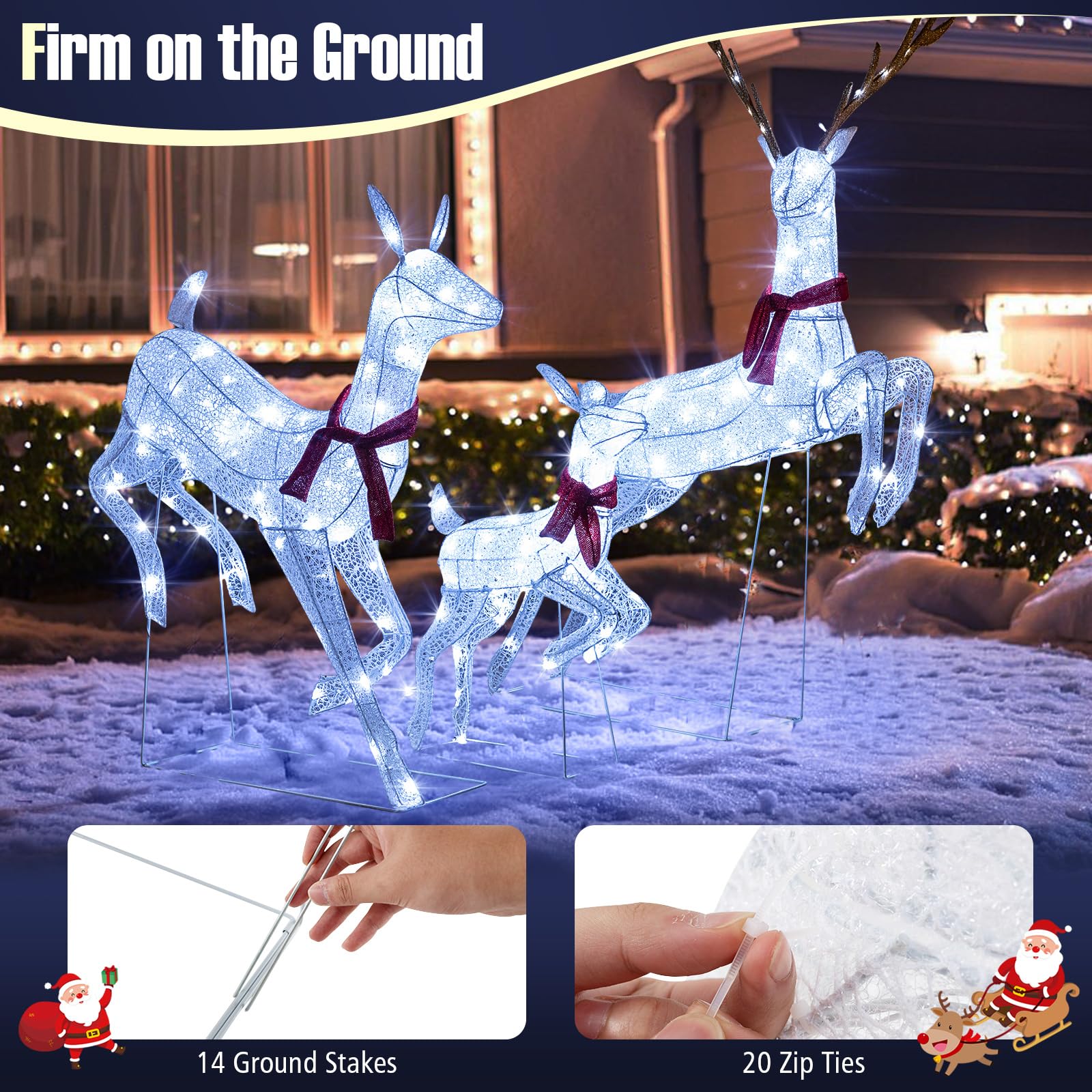 Featuring a vivid 5.3 ft buck, a charming 3.4 ft doe, and an adorable 2.5 ft fawn, each detailed with a festive scarf, this set promises to brighten your holiday decoration. The cold white LED lights also match winter holidays well. Crafted from weather-resistant materials and securely anchored with ground stakes and zip ties, these delightful figures will always keep beauty regardless of weather. Arrange them together for a traditional holiday vignette or place them separately to spread the Christmas cheer around. Celebrate this season with this exquisite display that brings joy and light to your festive gatherings.