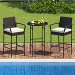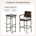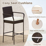Featuring sunproof and hand-crafted mix brown PE rattan, the outdoor bar chair set adds a touch of timeless beauty to your setting. Each barstool is designed for ergonomic comfort with inclined backrests, footrest and cozy cushion for relaxation. The robust metal frame ensures durability and stability, while the chic bar table with a tempered glass top provides a classy yet functional highlight. Ideal for backyard, garden, or poolside, this patio rattan bar furniture set promises to be a centerpiece for delightful outdoor gatherings, blending style and comfort seamlessly.