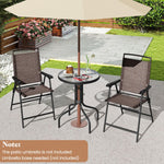 The patio set’s folding chairs are effortlessly manageable with no assembly required, sporting a sturdy metal frame that comfortably supports up to 330 lbs per chair, paired with a rippled tempered glass tabletop that is not only attractive but also easy to clean and safe. Each piece embodies practicality and beauty, with an umbrella hole of 1.57” accommodating shade on sunny days, and additional bottom fixing holes ensuring the umbrella pole stays securely in place, making it the perfect choice for enjoying relaxing moments outdoors.