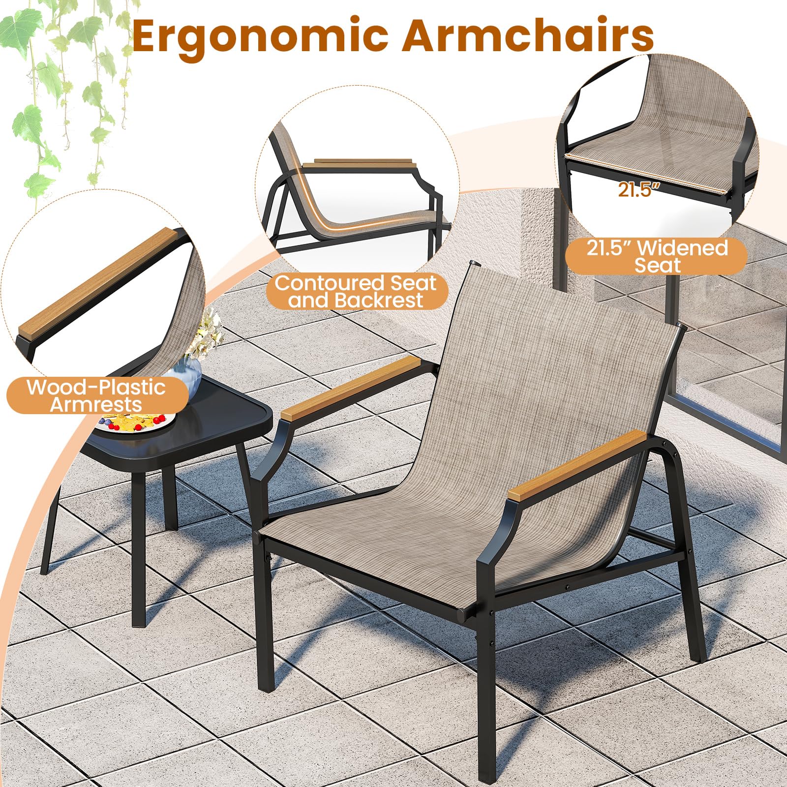 Constructed with premium metal pipes, the set ensures long-lasting stability and support. The chairs include widened 21.5-inch seats with ergonomic contours and wood-plastic armrests for enhanced comfort. Moreover, the sleek square coffee table boasts a tempered glass top, which is perfect to hold drinks and snacks. Suited for y balcony, porch, or garden, this bistro set with exquisite details promises to transform your outdoor area into a heaven for relaxation and engaging conversations.