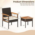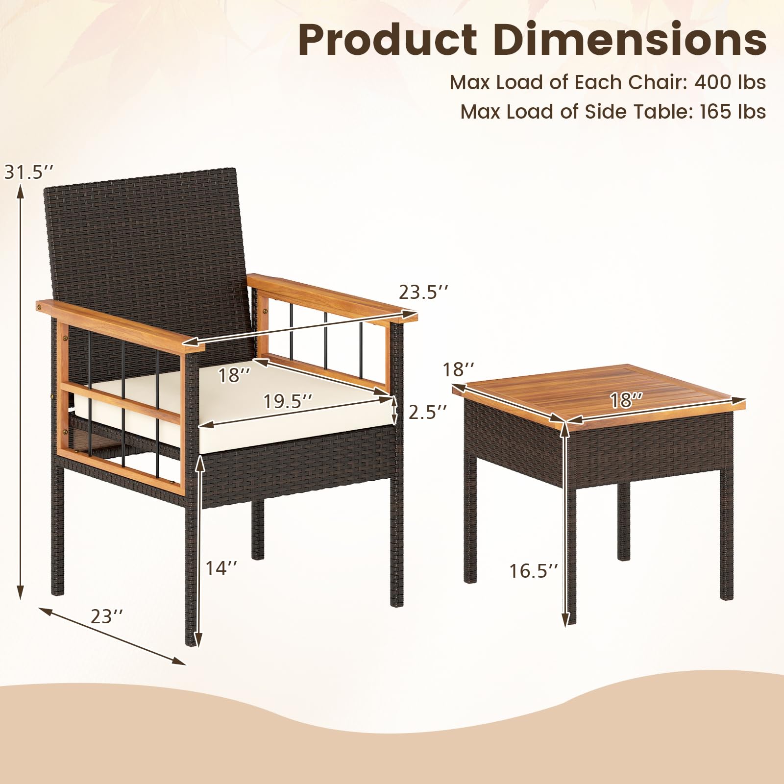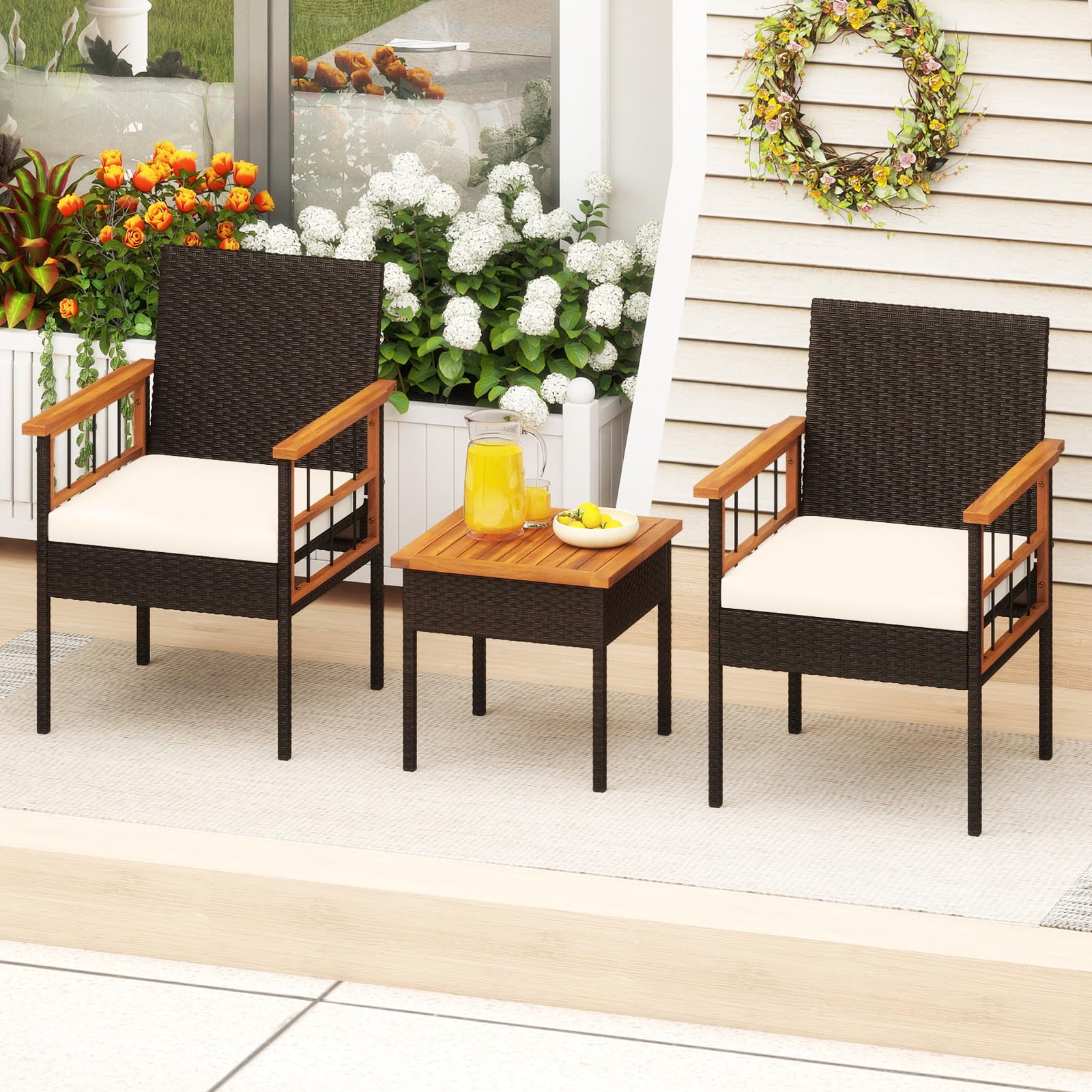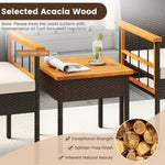 Combining handcrafted mix brown PE rattan and sturdy acacia wood with splinter-free finish, the outdoor bistro set ensures lasting beauty and durability. The comfy seat with soft cushion features ergonomic backrest and resilient sponge fillings, offering superior comfort and support. The compact side table adds convenient functionality, perfect for holding drinks or decorations. Ideal for patios, gardens, and poolside retreats, this stylish wicker set creates a cozy and inviting atmosphere for relaxing or entertaining outdoors.