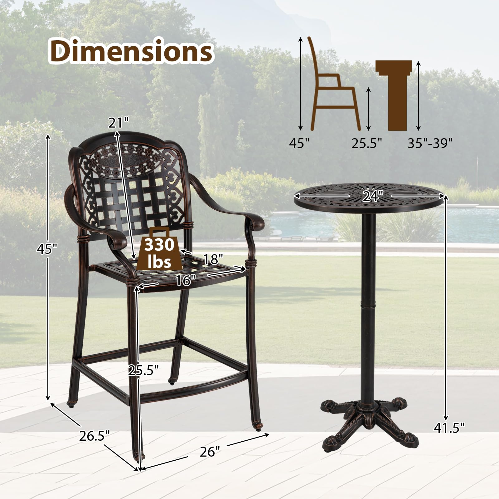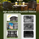 Elevate your outdoor living with this elegant 3-piece patio bar set, crafted from robust cast aluminum that resists rust. The vintage-inspired design features intricately patterned hollowed backrests and tabletop, adding a touch of sophistication to your porch, garden or poolside. Designed for comfort, the bar stools include inclined backrests, curved armrests, contoured seats and built-in footrests to support relaxed seating. Stability is ensured by the table's cross-shaped base and adjustable foot pads on both the table and chairs, allowing the set to remain balanced on uneven surfaces. Versatile and stylish, this set complements a variety of outdoor spaces, making it an ideal choice to enhance your alfresco entertaining area.