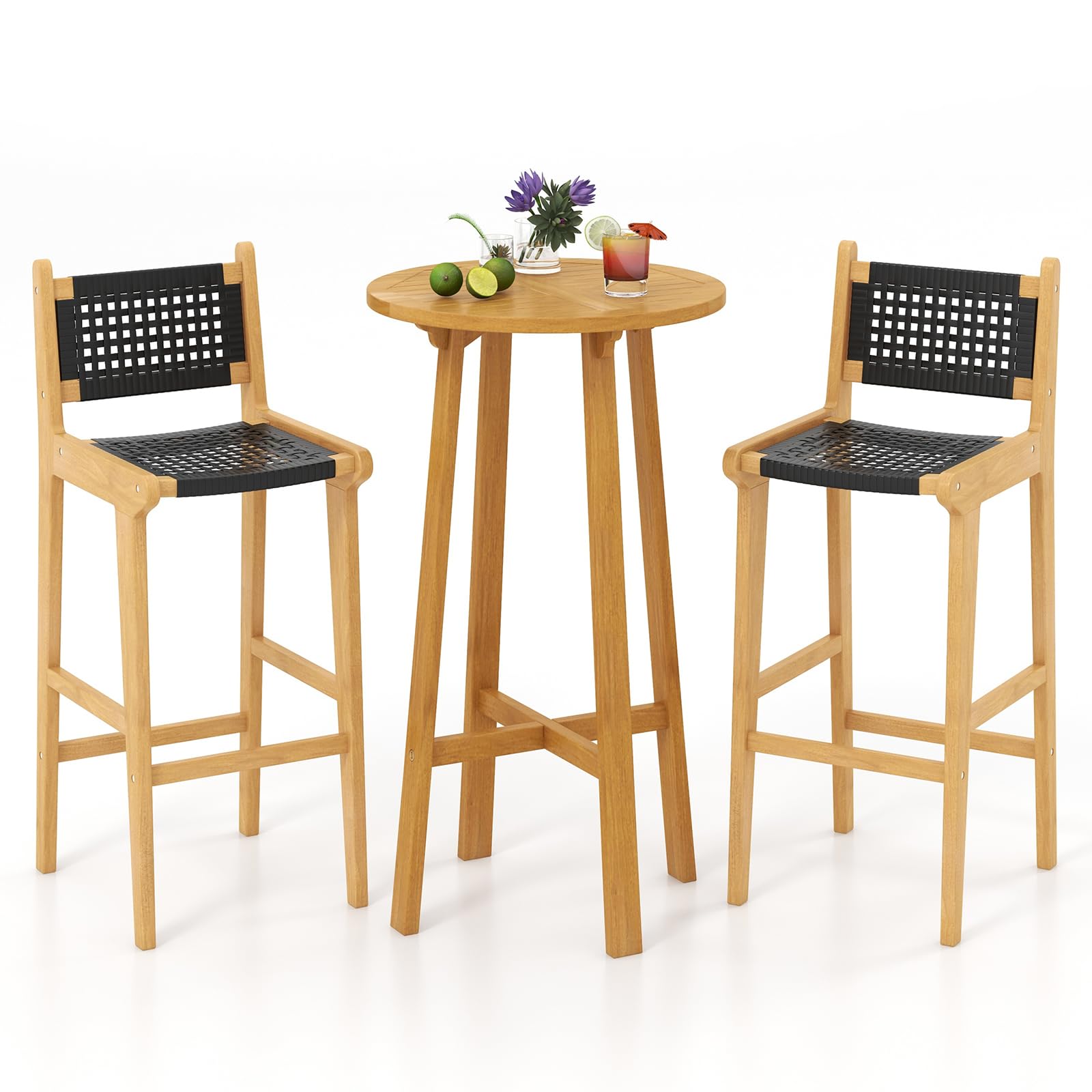 - Teak Wood Bar Set: Elevate your outdoor or indoor gatherings with the teak wood bar set, featuring a robust bar table and dual 30” high bar height stools. The wooden bar table set is designed to blend seamlessly into gardens, decks, kitchens, and beyond.