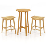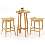 Introducing the 3-piece bar set: a round table and 2 saddle stools, crafted for both indoor elegance and outdoor durability. These stools, with their integrated handles, are designed for effortless transport. Solid teak wood construction ensures that each stool can hold up to 330 lbs, while the table bears a sturdy 110 lbs. Comfort is key with contoured saddle seating and 9” footrests. The bar table’s X-shaped base not only promises stability but also functions as a 10.5” footrest. The chic PE rattan weave is sophisticated. The outdoor bistro set is easy to maintain, splinter-free for safety. To extend the product’s lifespan, please avoid leaving it outdoors in the rain.