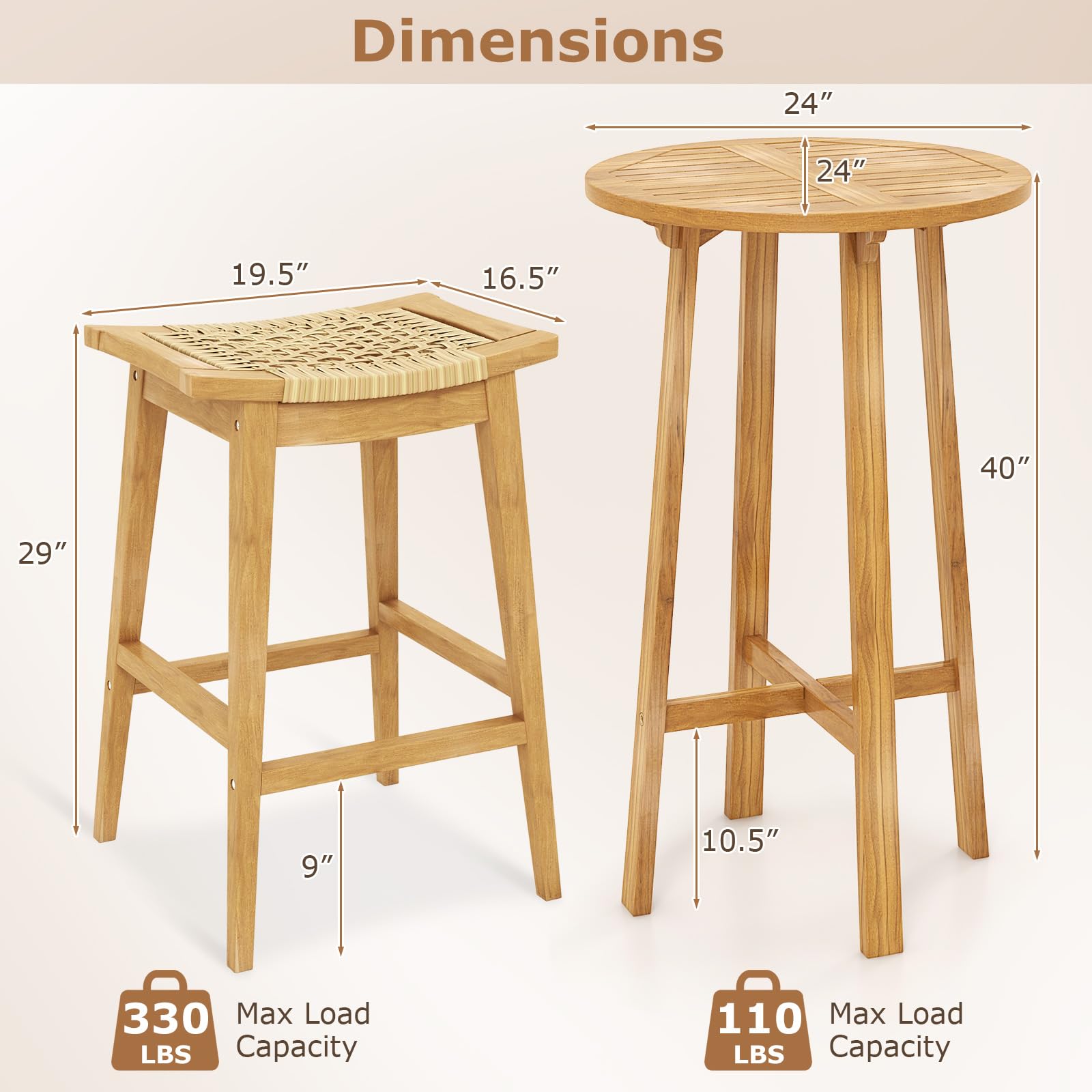 - Teak Wood Support: Made of solid teak wood, the bar table set promises a strong foundation. Each saddle stool confidently bears up to 330 lbs, while the table stands firm under 110 lbs, ensuring your gatherings are stable and secure.