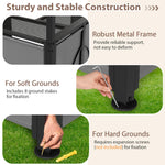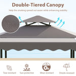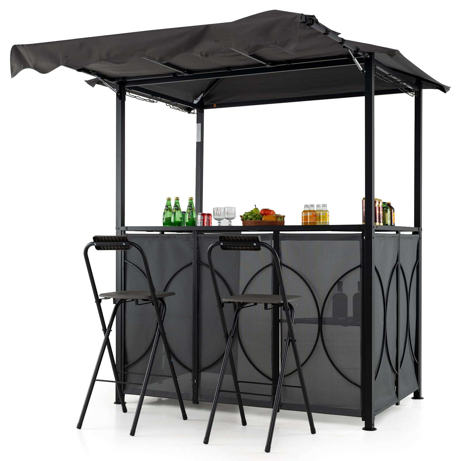 Our innovative grill gazebo not only provides a sheltered space for grilling regardless of the weather, but also enhances your entertaining capabilities with its built-in bar table and 2 foldable bar chairs, complete with metal shelves and glass holders, providing easy access to grilling accessories. The integrated extra awning on one side allows you to adjust the coverage for additional shade, effortlessly expanded or retracted with the latest hydraulic rods for your convenience. Additionally, the tent is crafted from a reliable polyester canopy and supported by a robust metal frame, which is built to withstand various weather conditions, ensuring long-term outdoor use. Thanks to its vented top and anchoring plates with 8 ground stakes, the gazebo could keep stake even in breezy conditions. Whether you're hosting a party or enjoying a quiet family dinner, this barbecue gazebo with its thoughtful features and stylish appearance makes it a must-have for any outdoor space!