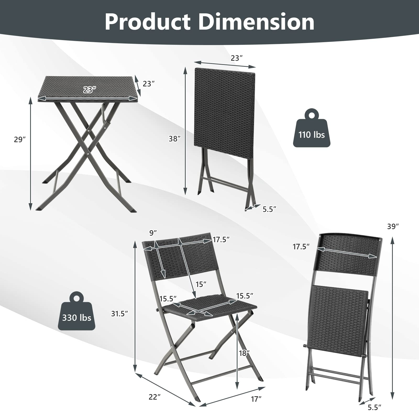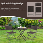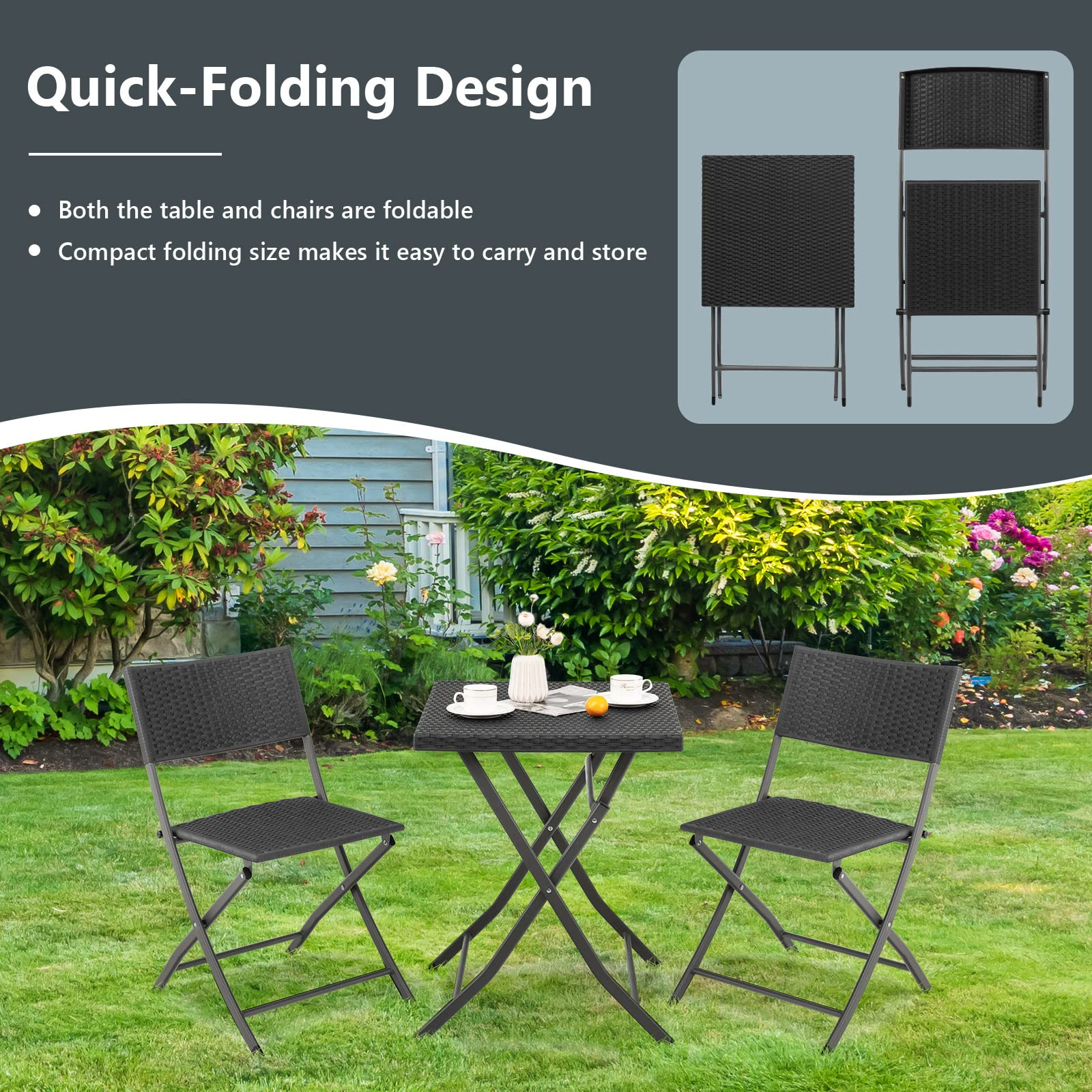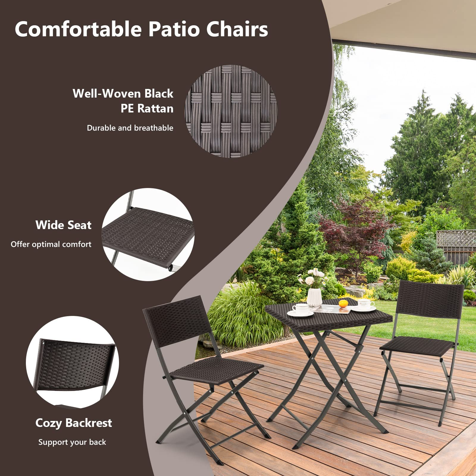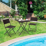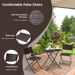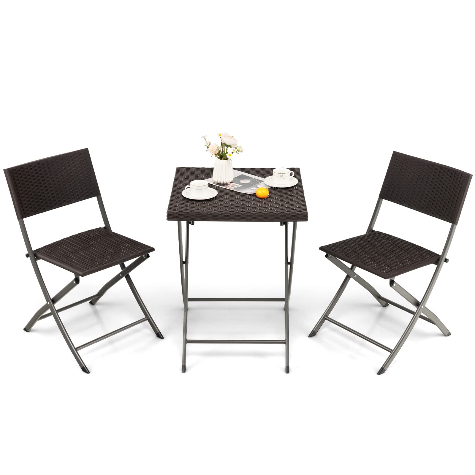 The outdoor chair set features a plastic-sprayed metal frame and stylish rattan, which can withstand long-time outdoor use. Including 2 chairs and a matching table, the patio set provides a perfect place for you to have a drink and enjoy the pleasure with your beloved one as well. Furthermore, the folding design makes them space-saving and easy to carry and store. Plus, the chairs are ergonomically designed with breathable rattan, so that you can sit on the chair for a long time without any discomfort. All in all, this bistro set is the ideal choice for outdoor activities.