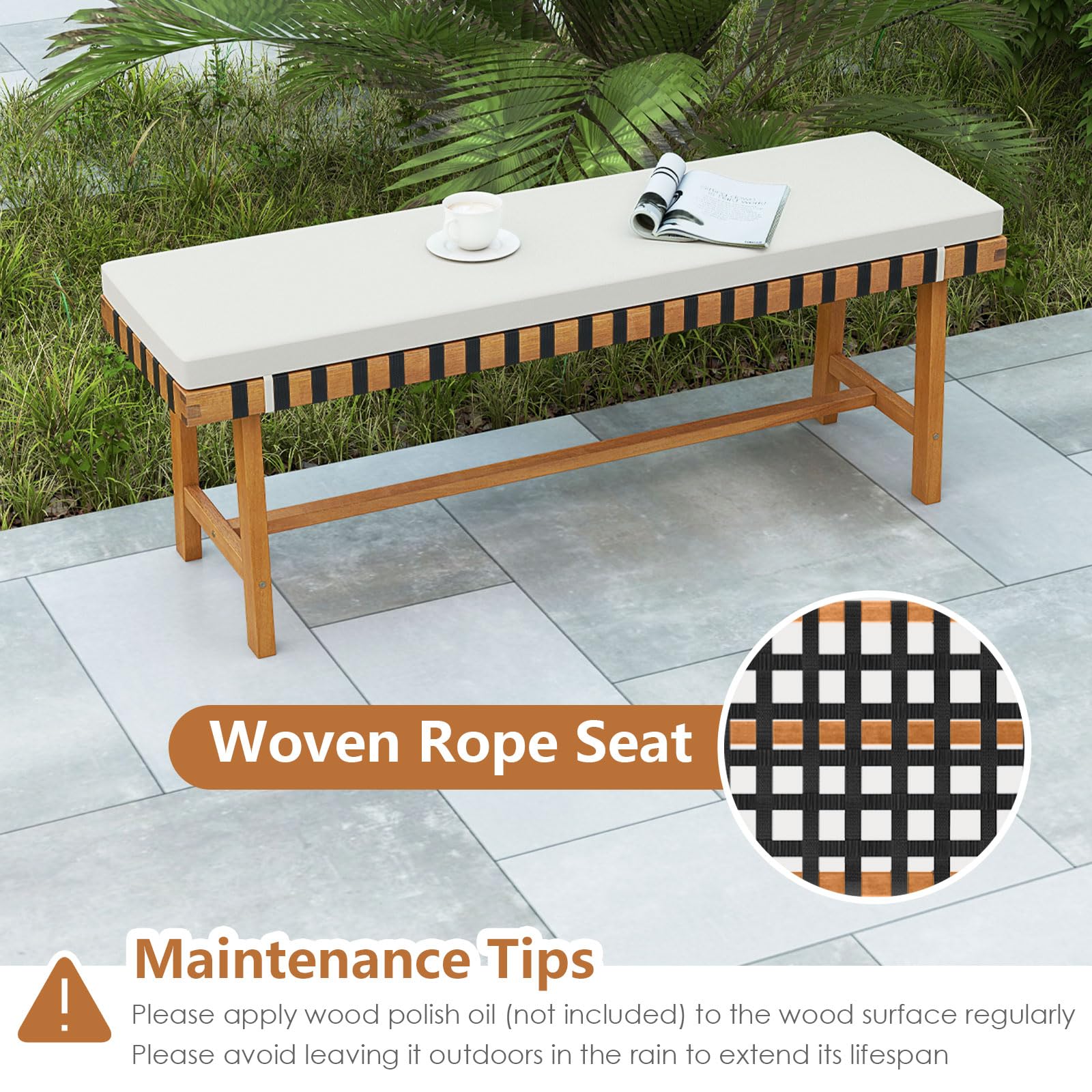 Material: Acacia Wood, Weaving Ropes, Polyester Fabric, Sponge