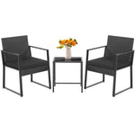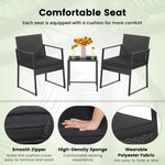 Enjoy endless comfort and ease on this 3-piece patio rattan chair set for outdoor relaxation. With a curved backrest, the ergonomic rattan chair will make you fully relaxed. And the seat cushions with elastic sponge make the seat softer and more comfortable to sit on. Also, both the chairs and table are super sturdy with heavy-duty metal frames. The powder-coated surface makes the main frame not easy to rust. Moreover, the rattan surface not only looks elegant but also can withstand long-time outdoor use. And the maintenance is quite simple, as the cushion covers with zippers are easy to remove, and the tabletop is made of smooth tempered glass. If you love relaxing in outdoor places, this 3-piece patio set will be a good choice.