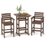 Constructed from premium HDPE material, the set is waterproof, sunproof, and anti-fading with sturdy stainless steel screws. The HDPE bistro bar set features a 30” slatted tabletop for easy maintenance and spacious usability. Each bar chair features a 105° inclined backrest, 3” armrests, and 2.5” footrests for ultimate comfort. The stylish, faux wood texture enhances outdoor aesthetics, making this patio bar set the perfect choice for entertaining or peaceful retreats. Lasting style and comfort, all year round!