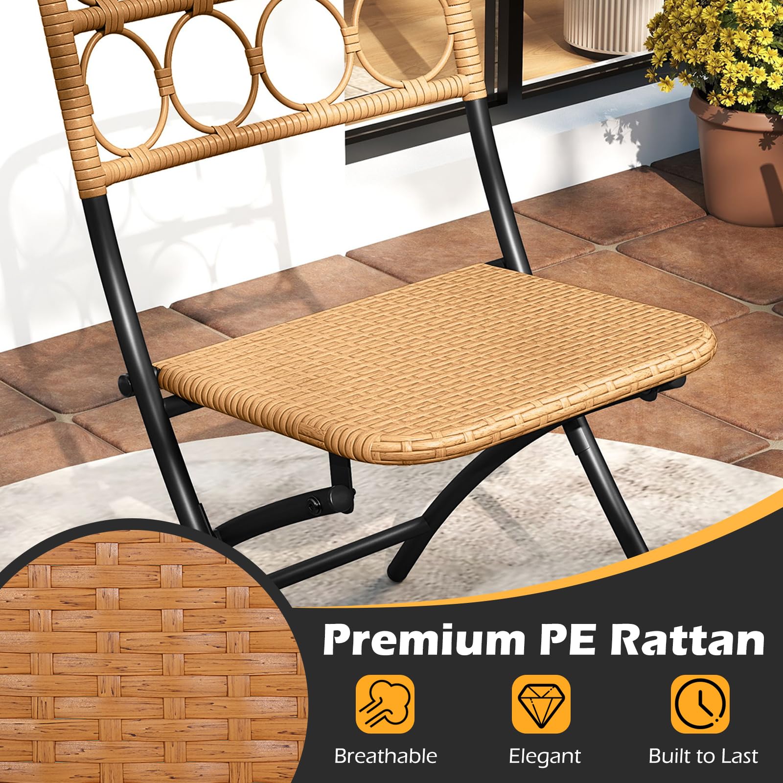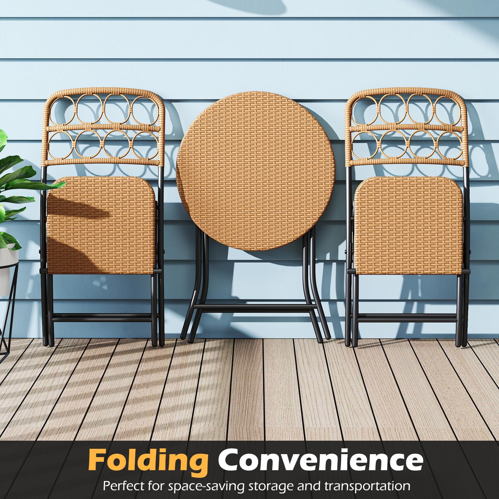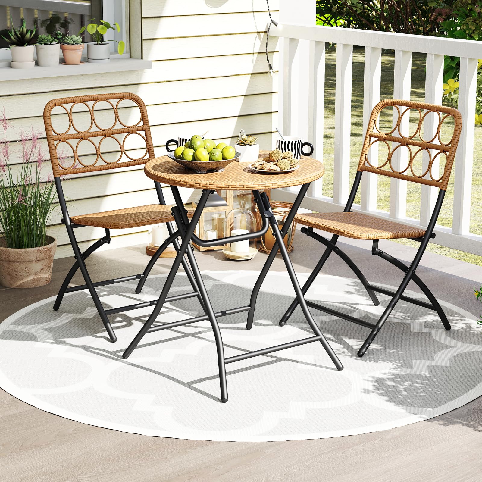 This 3-piece patio furniture set features premium PE rattan material that combines both breathable comfort and endurance. This set includes 2 chairs and a table, all designed with an X-shaped structure and reinforced crossbars for great stability. Additionally, the entire set is crafted to fold down to a compact size, making it easy to store and transport. The table's locking mechanism ensures safety by preventing accidental folding. Ideal for porch, garden, backyard or balcony, this stylish and versatile set is designed to suit various outdoor settings while providing a spacious and practical surface for your enjoyment.