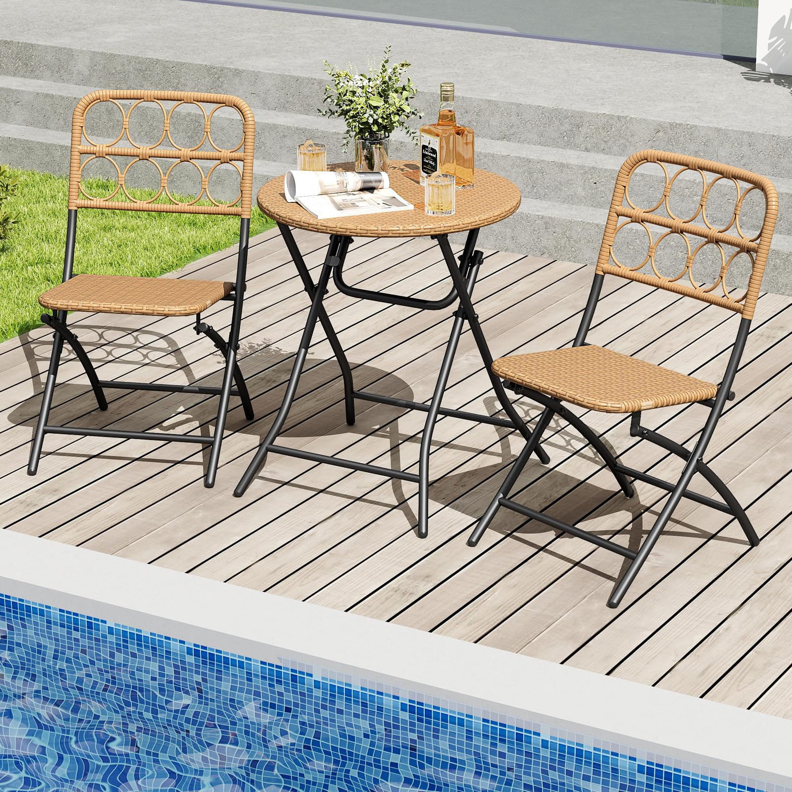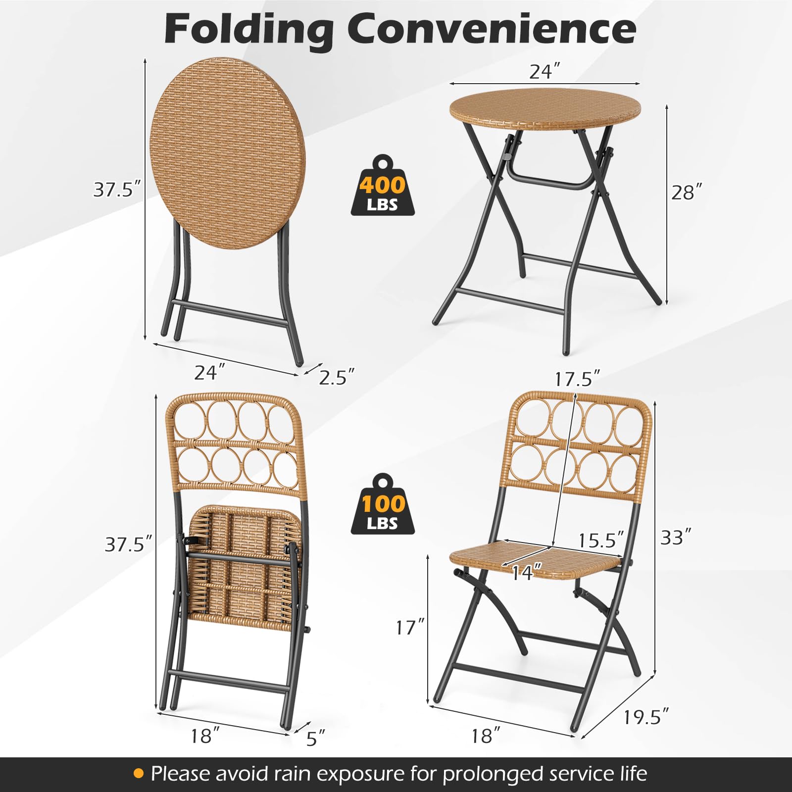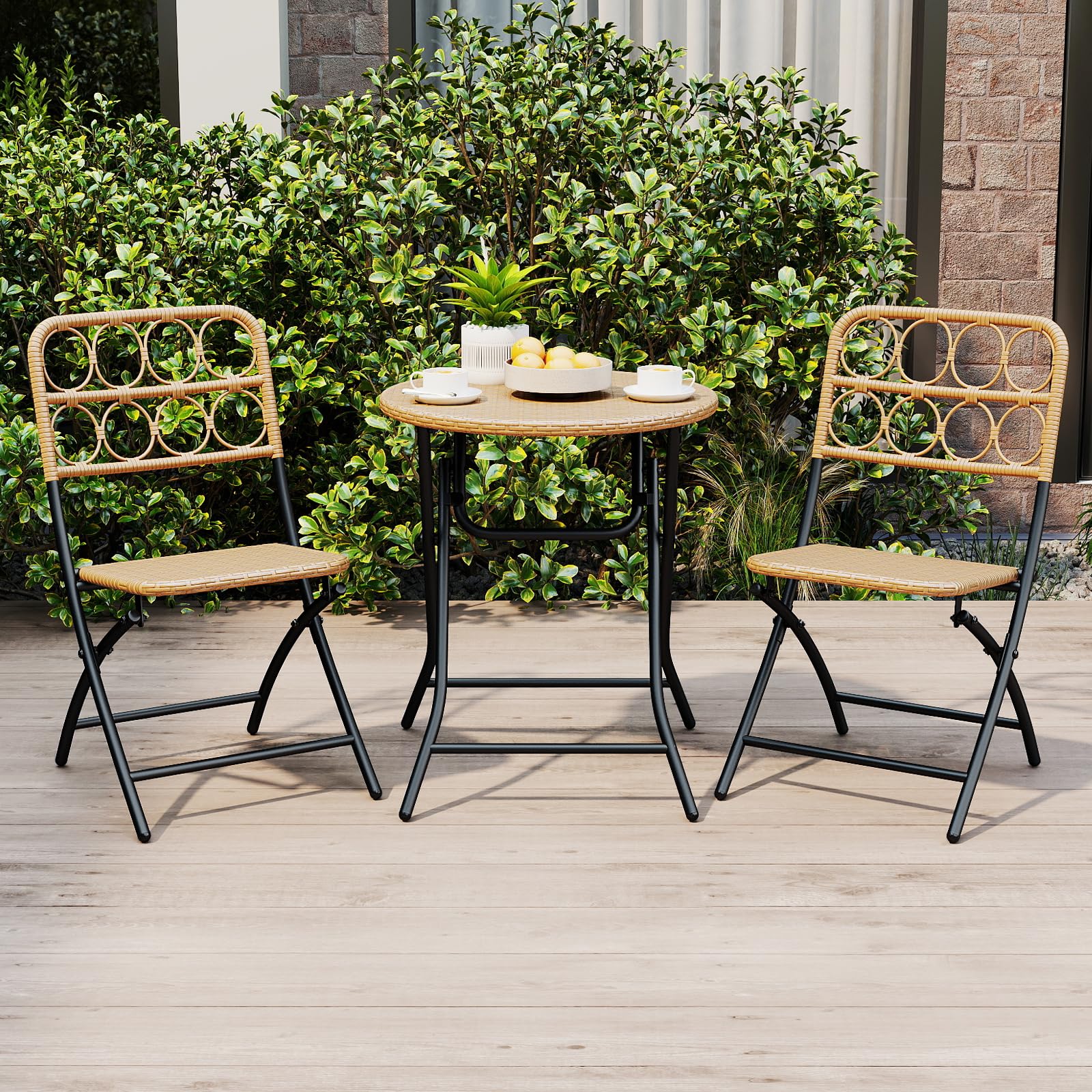 This 3-piece patio furniture set features premium PE rattan material that combines both breathable comfort and endurance. This set includes 2 chairs and a table, all designed with an X-shaped structure and reinforced crossbars for great stability. Additionally, the entire set is crafted to fold down to a compact size, making it easy to store and transport. The table's locking mechanism ensures safety by preventing accidental folding. Ideal for porch, garden, backyard or balcony, this stylish and versatile set is designed to suit various outdoor settings while providing a spacious and practical surface for your enjoyment.