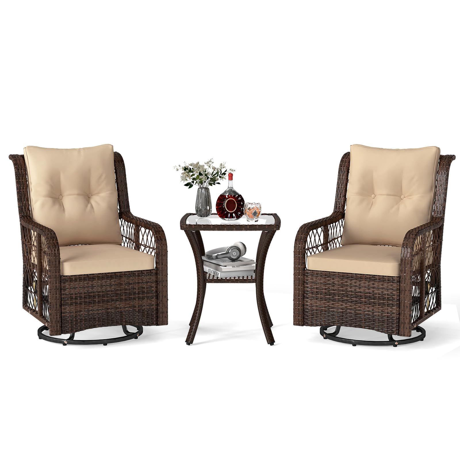 As a centerpiece of comfort, this set with 360° swiveling and rocking motion is ideal for unwinding and entertaining. Crafted with elegant and anti-fading woven wicker and complemented by elastic cushions, each chair will offer you optimal softness and coziness. Moreover, a double-tier coffee table with tempered glass tabletop offers both beauty and convenience. This patio swiveling rocking set will be a perfect addition to your backyard, poolside or balcony. Curate your own tranquil oasis for solitary moments or social gatherings.