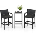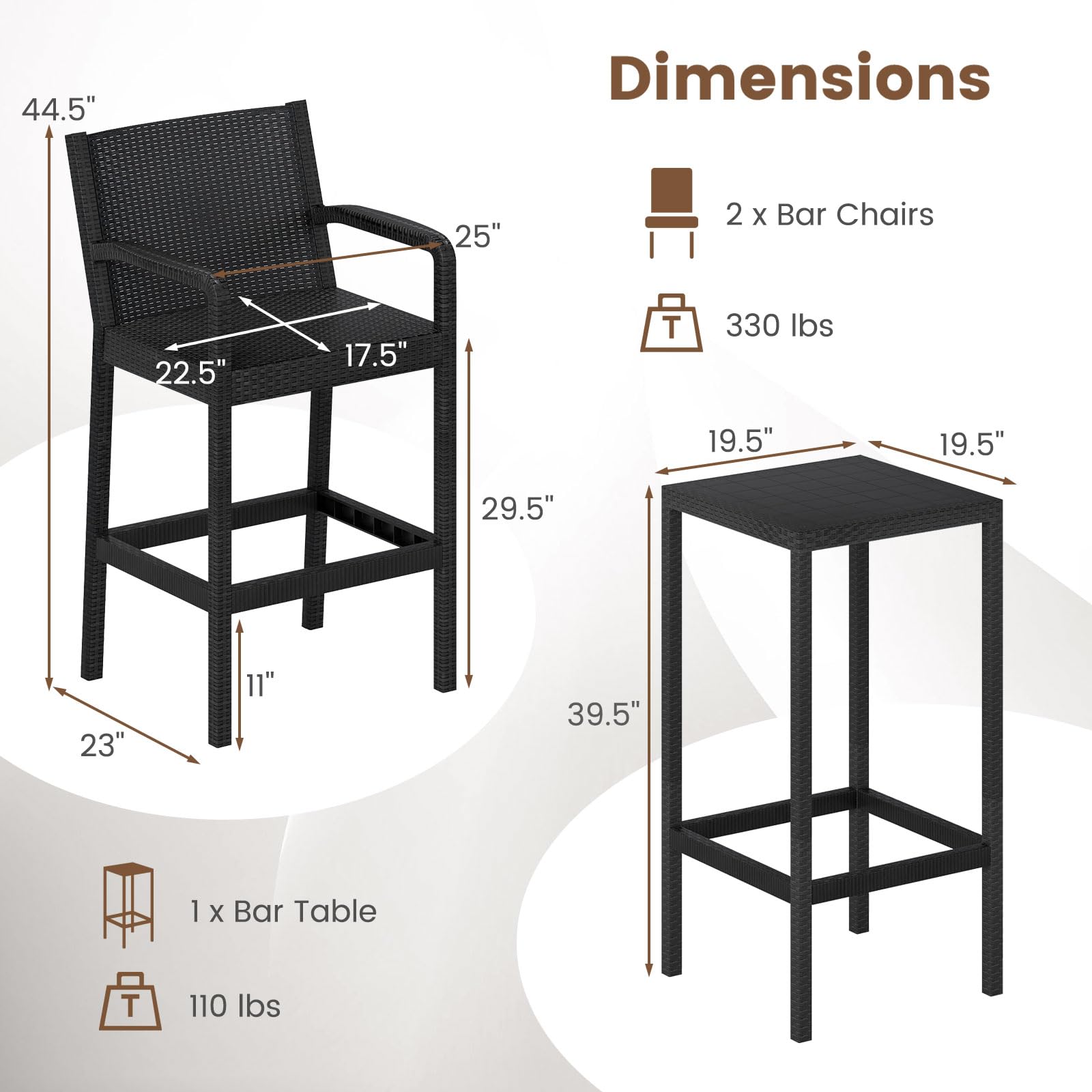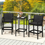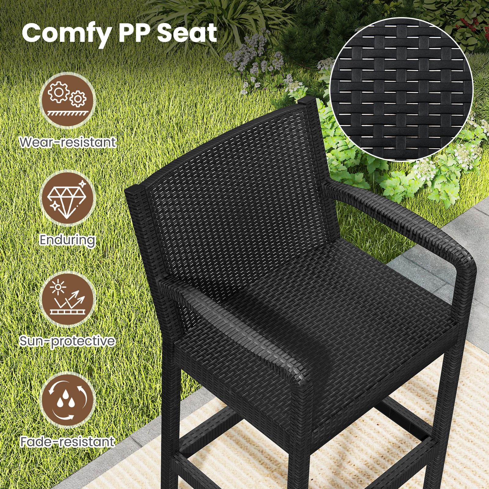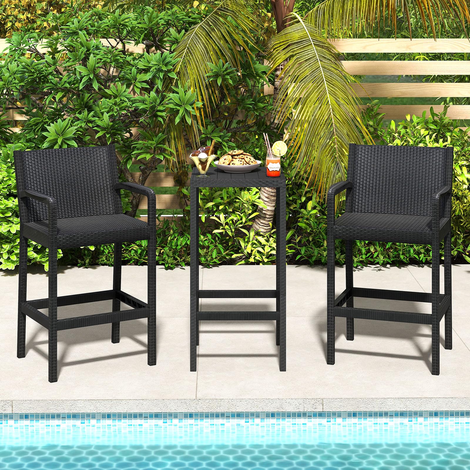 Each bar stool is equipped with curved backrest and armrests for optimal comfort. The stools come with a wide PP seat for comfortable seating experience. Besides, the integrated footrest makes it easier to unwind and relax. Built to last, this outdoor bistro set is crafted from sturdy metal frame that can support up to 330 lbs. Ideal for garden, balcony, or poolside areas, this bar height table and stools set offers a chic and functional addition to your outdoor spaces.