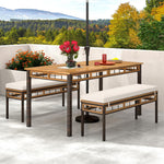 This outdoor furniture set features a rectangular tabletop with a 1.97” umbrella hole suitable for most standard patio umbrellas (not included), providing ample space and shade during gatherings. The garden benches include soft cushions secured by fixing ties, and their zippered covers make cleaning easy, ensuring comfort and convenience. Crafted from solid acacia wood, this outdoor dining set with benches offers excellent hardness and natural beauty, while the sun-protective PE wicker wrapped around the sturdy metal frame ensures lasting durability and an elegant hand-woven design.