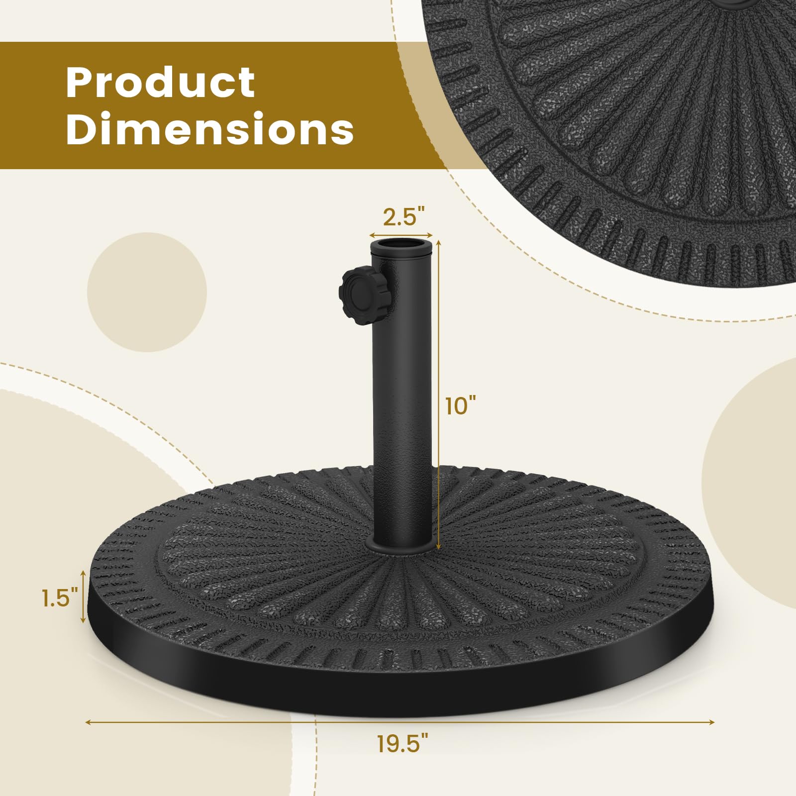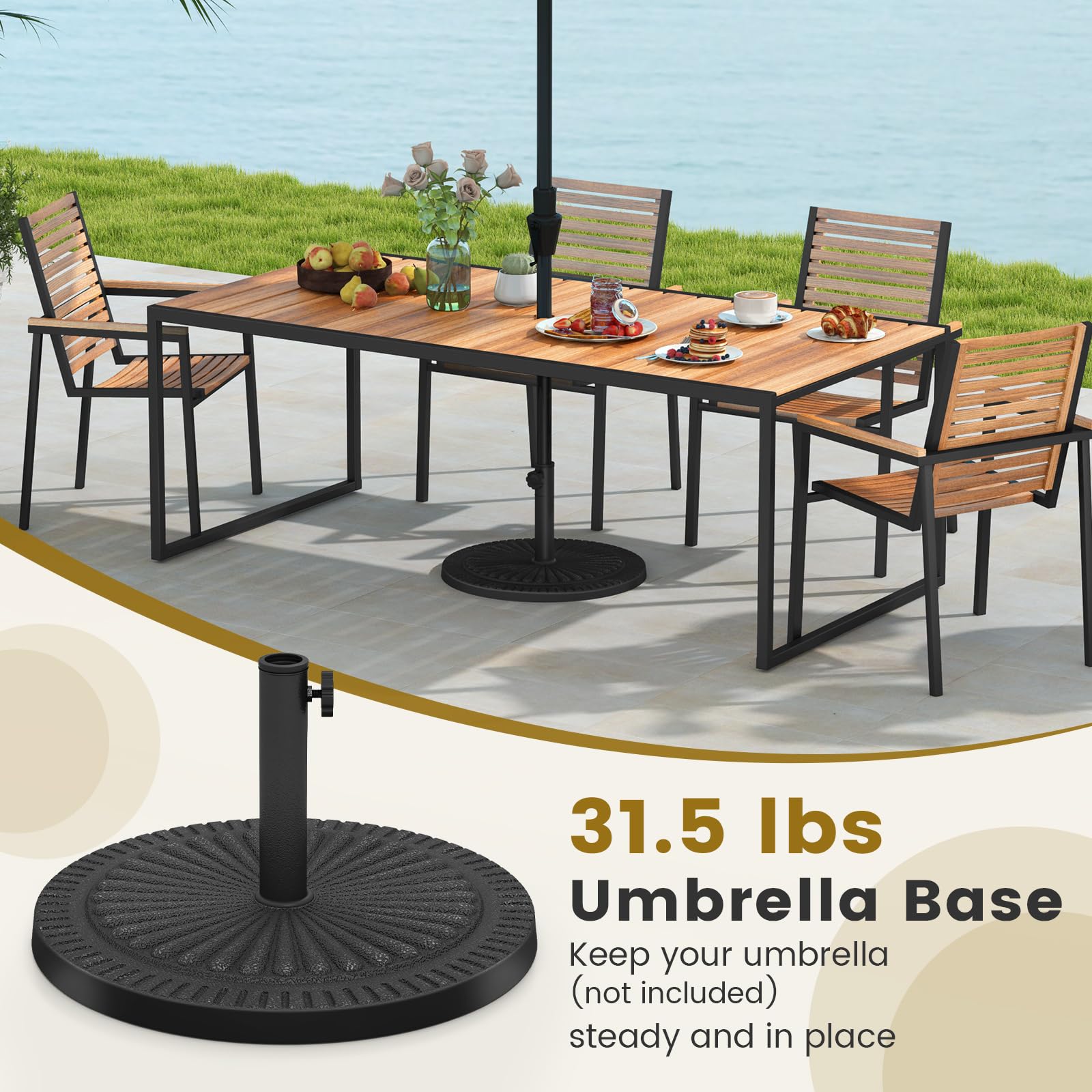 An excellent umbrella base is indispensable for your patio umbrellas! Whether it's rainy or windy, our umbrella base will stand in place to stabilize your umbrellas with superior quality. Constructed of high-quality resin and stainless accessories, our umbrella base is aging resistant and durable enough to withstand any weather conditions. It can be placed anywhere, such as gardens, patios, balconies, etc. You can also use it as a sun protection item while relaxing on a hot summer day. With antique styling and elegant bronze finish, it's designed in retro style to bring additional beauty to your house. It comes with all required accessories and installation guides, making it easy to install by yourself.