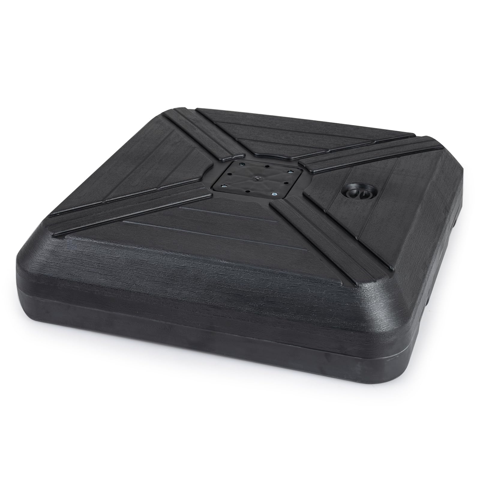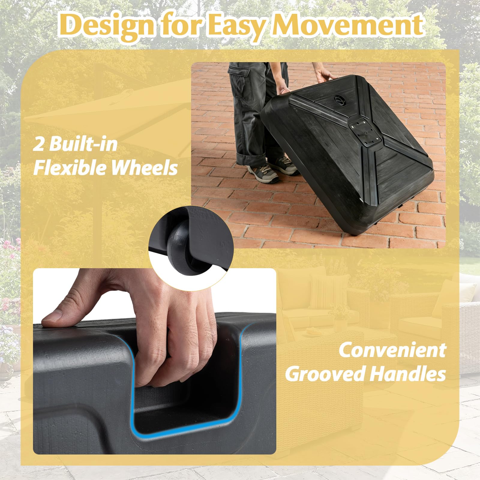 The refillable reservoir includes both a water inlet spout and a drain spout, allowing quick filling with water, sand, or water and sand to enhance stability. Its reinforced HDPE shell provides sun protection, crack resistance, and fade resistance, ensuring reliable long-term performance outdoors. With the included metal cross base and fastening screws, the stand securely fits offset hanging umbrellas. In addition, completing the design are built-in 2 wheels and grooved handles that make repositioning smooth and effortless. From patios to poolside spaces, this functional umbrella base is built for versatile and dependable outdoor use.
