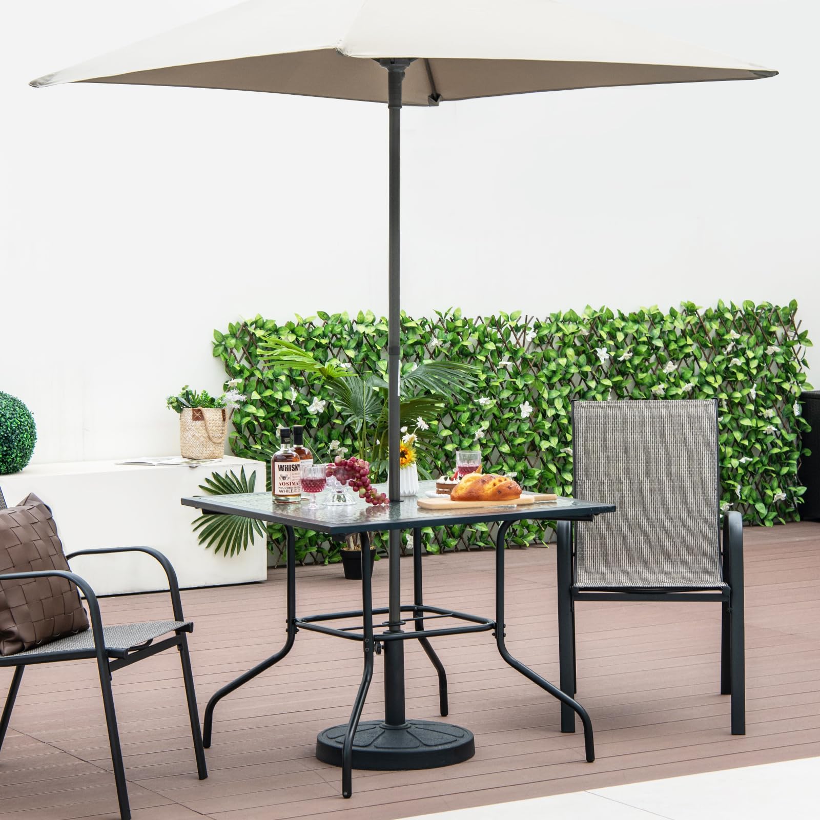 Create an inviting and stylish outdoor dining space with our high-quality patio dining table. Designed with a tempered glass table top, this dining table not only enhances the aesthetics of your outdoor area, but also provides durability and strength. The dining table features a sturdy metal frame that can withstand the rigors of outdoor use. The sturdy metal frame also provides stability with a weight capacity of up to 165 pounds. The metal frame features a powder-coated finish for rust resistance. Additionally, our patio dining table is designed to accommodate a straight umbrella——thanks to the umbrella hole in the center! The table also includes an umbrella stand bracket underneath the table top that provides additional support to keep the umbrella in place and prevent it from wobbling. All in all, versatility is also one of the main features of our outdoor dining table. Whether you use it on a balcony, poolside, terrace, porch, or in the garden, this dining table can easily match it.
