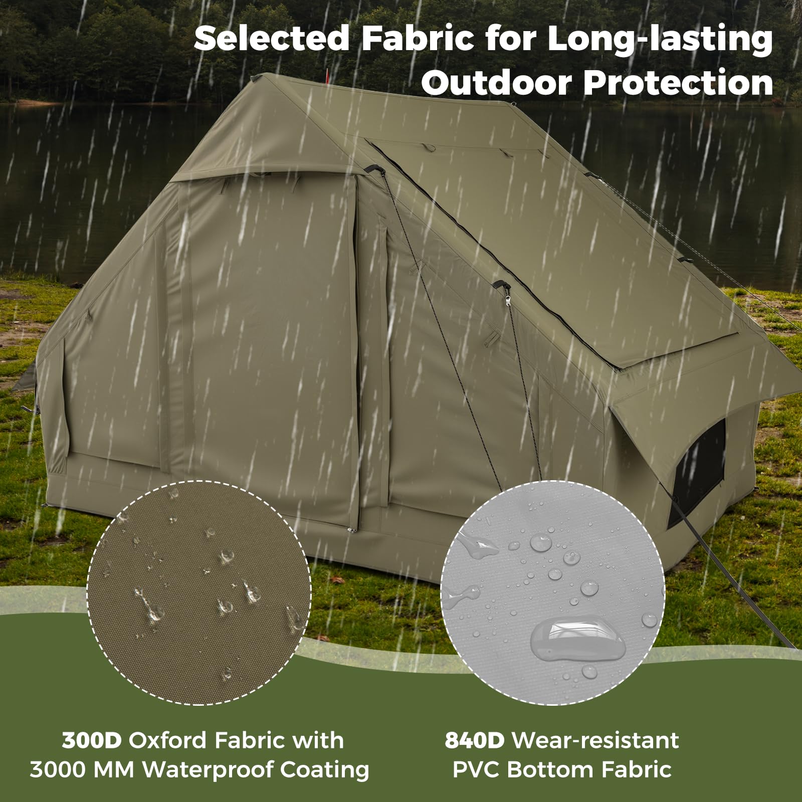 This spacious tent offers a 65 sq.ft footprint and a 6.2 ft inner center height, comfortably accommodating 4-6 people. The tent features a stable and wind-proof frame with wind-resistant webbing, anchor points, and pre-installed wind ropes for enhanced stability. Additionally, made with premium 300D Oxford fabric with a 3000 MM waterproof coating for the canopy and 840D wear-resistant PVC for the bottom, this outdoor blow up tent provides reliable protection in various weather conditions. When not in use, it folds compactly into the provided carrying bag. Hence, this large camping tent is ideal for family camping, short trips, and beach activities.