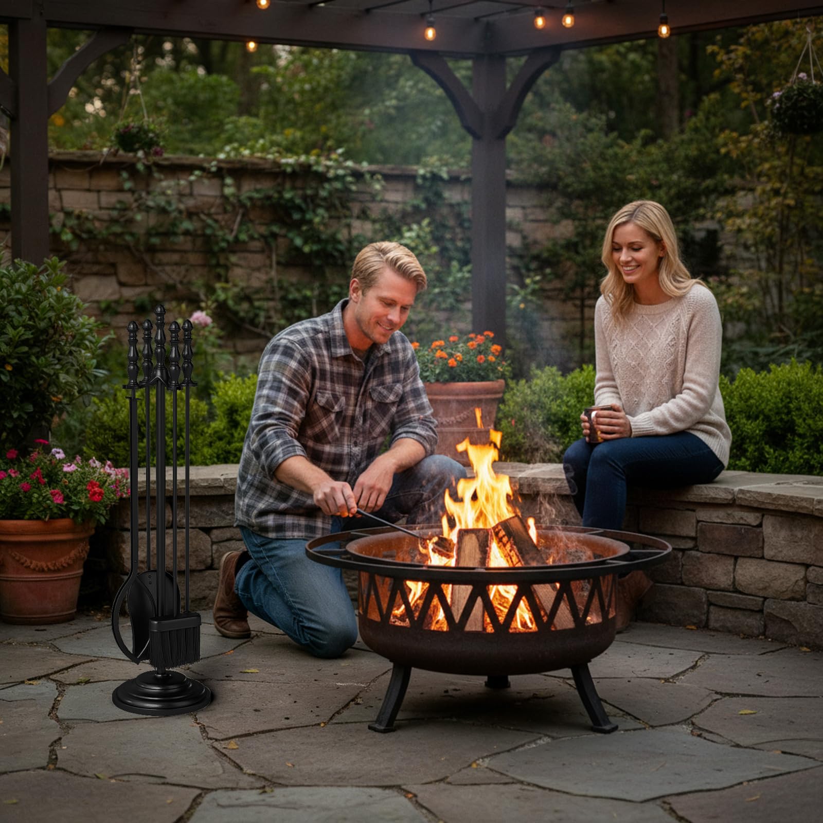 This 4-in-1 Fireplace Tool Set is a must-have for anyone looking to manage and maintain their fireplace with ease and efficiency. It includes a poker, a tong, a shovel, and a brush, all essential tools for keeping your fireplace in top condition. Each tool is equipped with ergonomic and exquisite handles that provide a comfortable grip, protecting your hands from heat and ensuring ease of use even during prolonged periods. Crafted from premium heat-resistant metal, these tools are built to last, with a classy finish that complements any home decoration while resisting wear and tear. The wide support base of the stand keeps the tools neatly organized and stable, preventing them from tipping over. This indoor firepit tool set is designed for wide application, helping you maintain a safe distance from the flames.