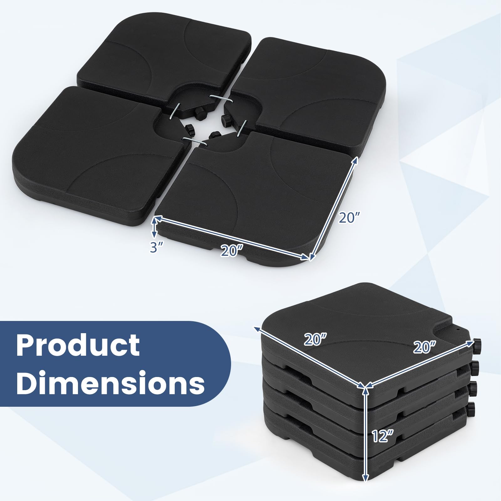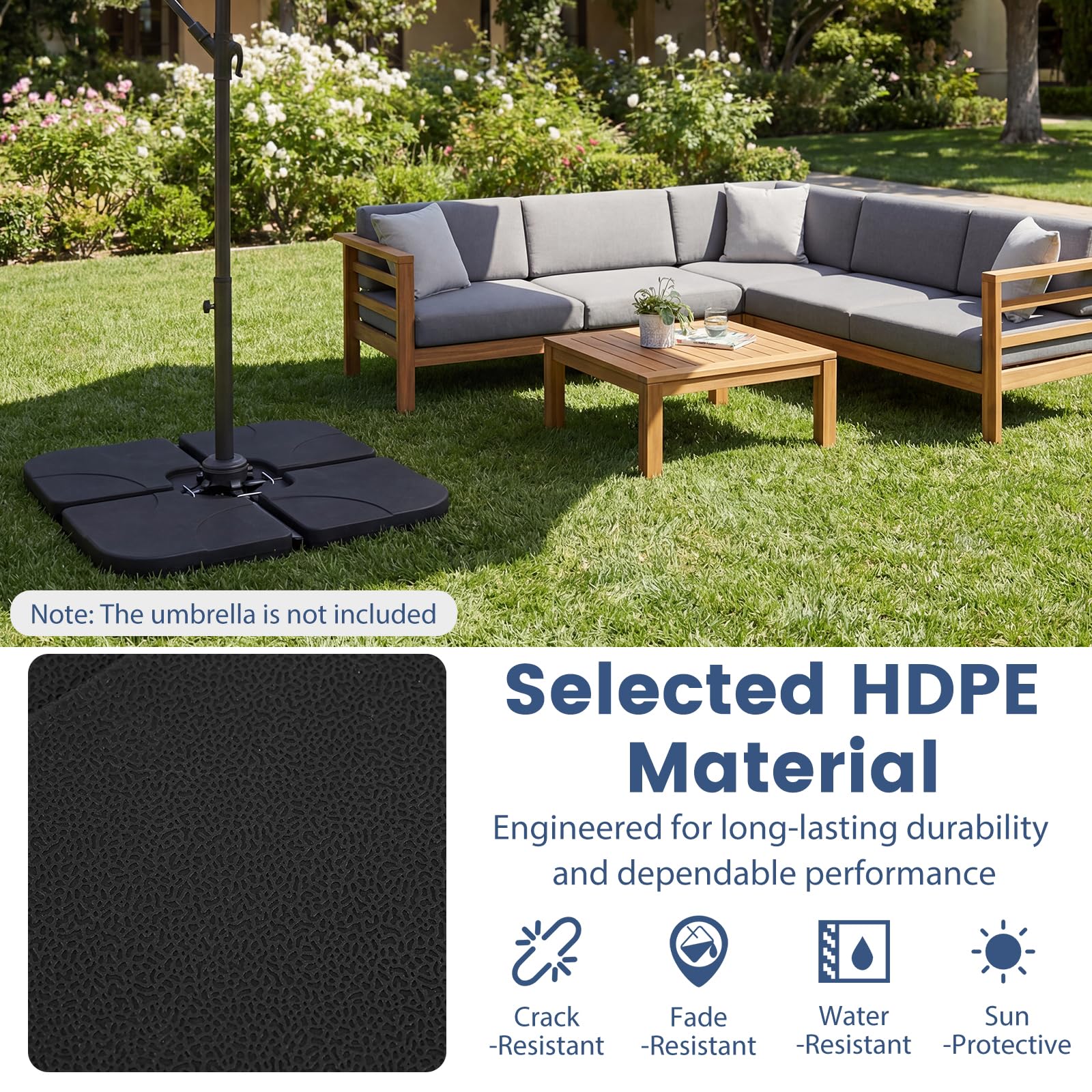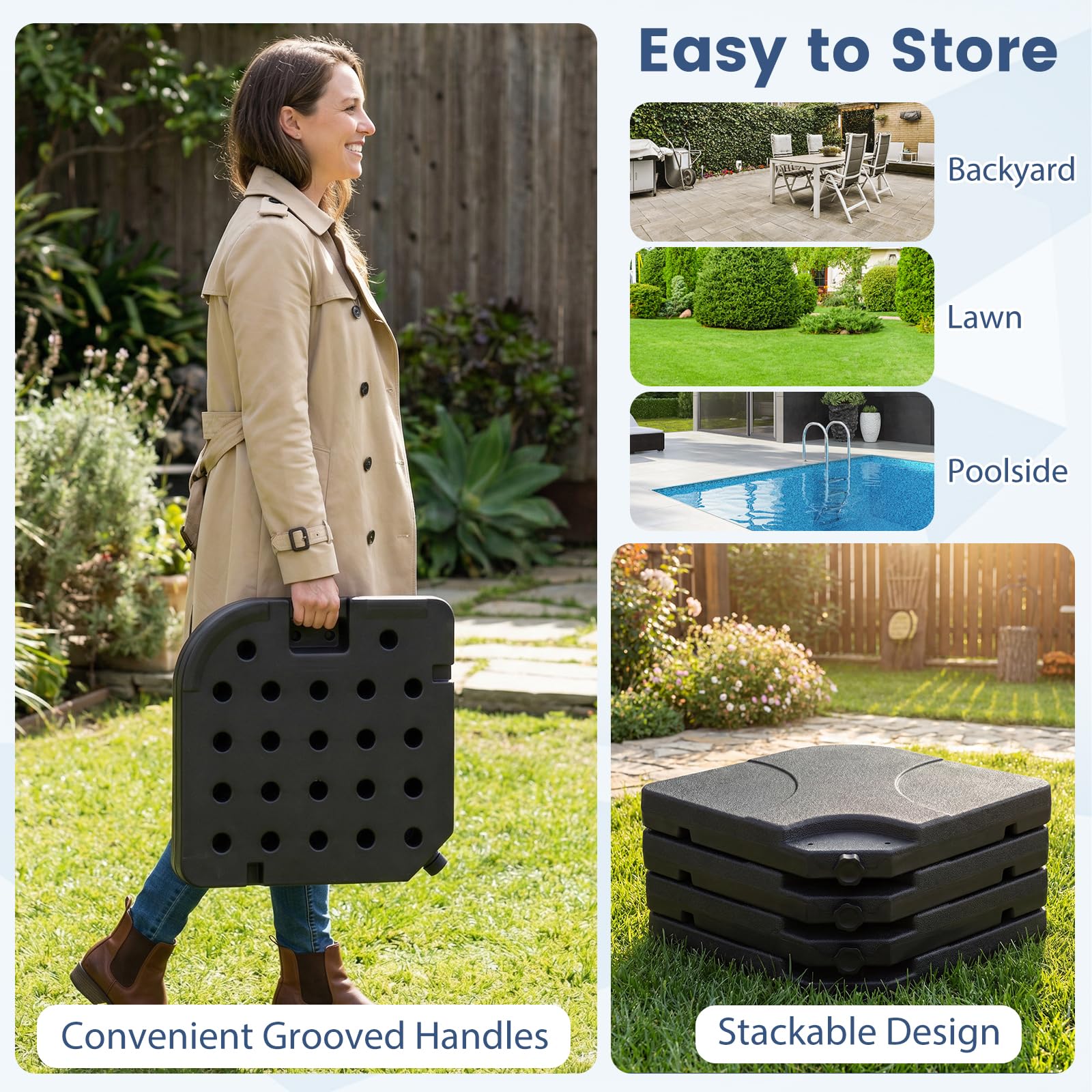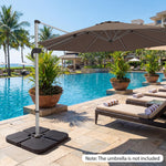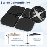 Designed with 4 interlocking plates and reinforced metal locking pins, it ensures up to 164 lbs of combined sand and water weight to keep umbrellas steady in breezy outdoor conditions. Constructed from premium HDPE, it withstands sun, rain, and daily wear without cracking or fading. Wide fill ports with secure caps allow for fast filling, up to 132 lbs with water or 152 lbs with sand. Built-in grooved handles simplify transport and repositioning, while the stackable design maximizes storage space. Compatible with 9-10 ft offset hanging umbrellas and 8 ft cantilever umbrellas, this base is ideal for poolsides, yards, and gardens.