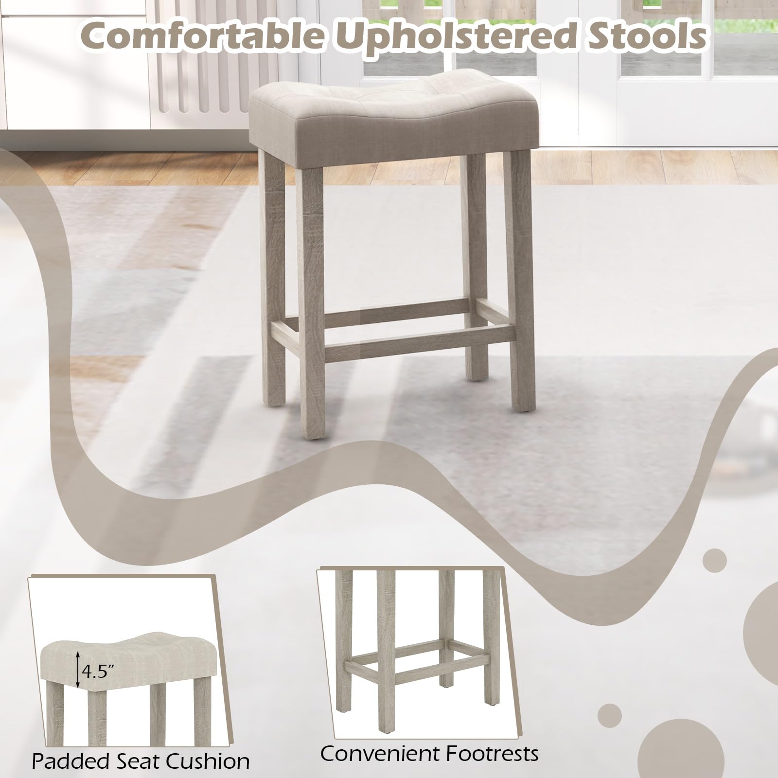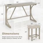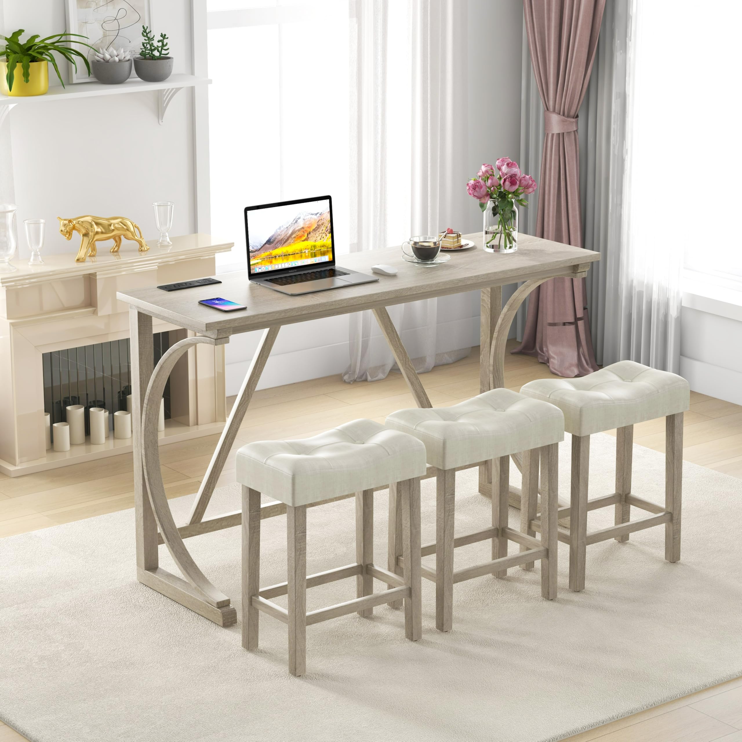 The counter-height table includes a built-in power outlet, ideal for charging devices while dining or working. Paired with three upholstered stools, this set delivers comfort and convenience in any setting. The generous tabletop offers ample room for dishes and decor, while the stools slide neatly underneath to save space. Crafted with a solid wood frame, this set ensures lasting stability and everyday reliability. Perfect for creating a cozy kitchen nook, adding seating in the living area, or enhancing a casual dining space—this adaptable table and stool set fits seamlessly into your lifestyle.