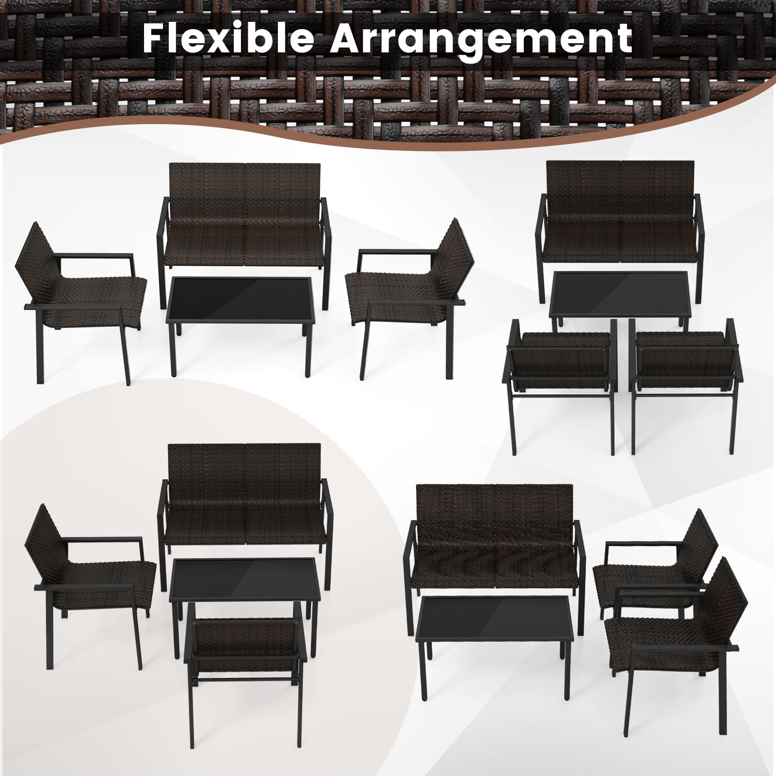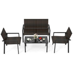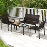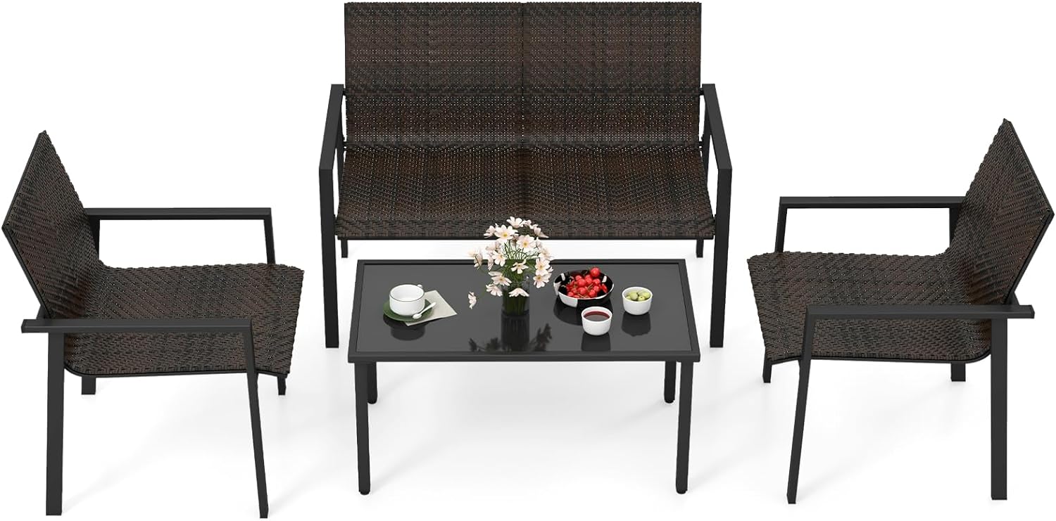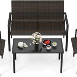 With better machine-woven quality, the rattan chairs feature refined look that resists fading. Coupled with ergonomic design, every seat promises relaxation, easing back stress. The strong metal framework ensures longevity while adjustable footpads add extra stability. Moreover, the spacious coffee table with a sleek tempered glass top offers more convenience for you to fetch food or drinks. This 4-piece patio set, complete with two chairs, a loveseat, and a coffee table, allows for personalized layout, effortlessly adapting to your outdoor space. Elevate your patio to a haven of comfort with this exquisite furniture set.