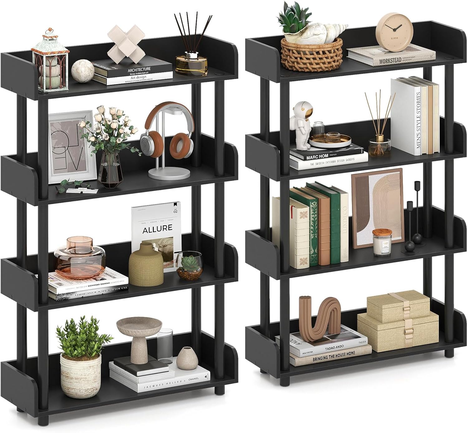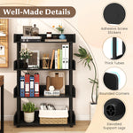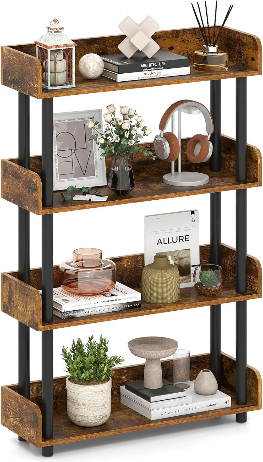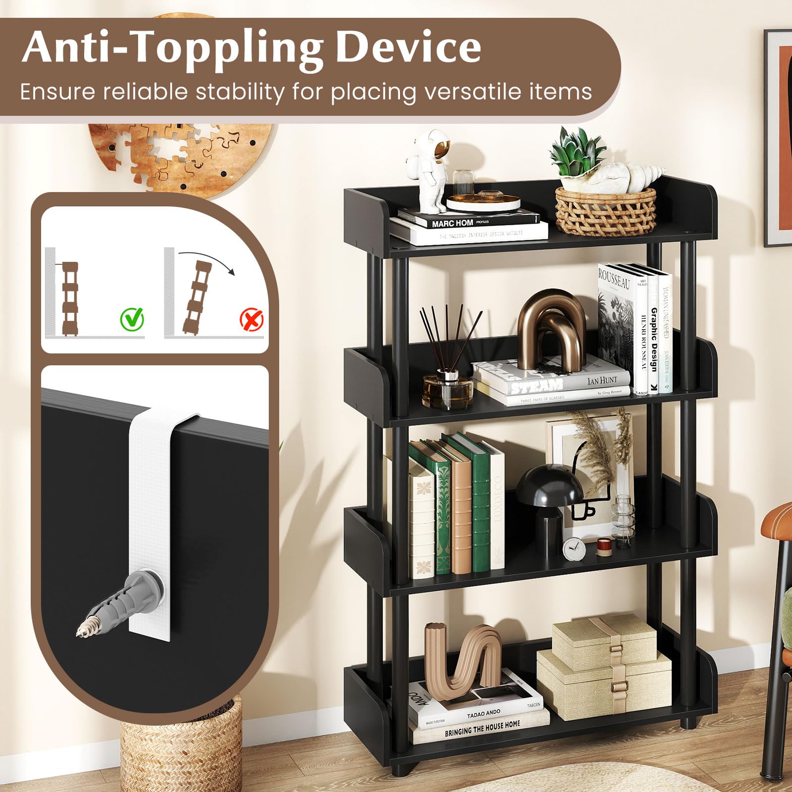 This minimalist and compact 4-tier bookshelf maximizes indoor space with its sleek design, perfect for organizing magazines, plants and folders from the living area to the kitchen. Plus, crafted from solid and high-quality wooden boards and supported by elevated legs, this bookcase ensures long-lasting stability and sturdiness. Thoughtful safety features like anti-falling panels and an anti-toppling device provide extra security for your belongings, making this display rack a versatile and efficient organizer that combines modern simplicity with reliable functionality.