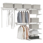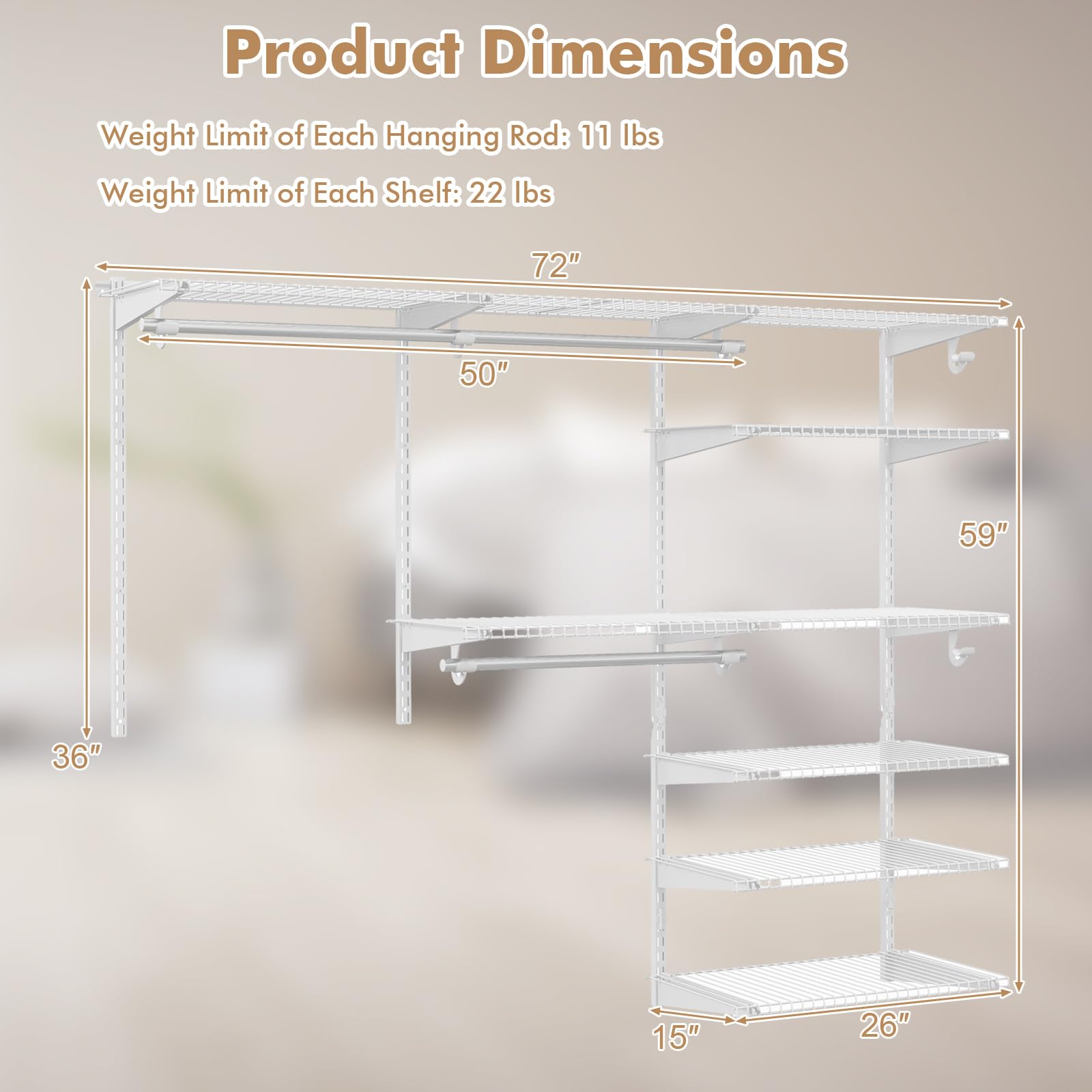 - 【Multi-tier Enlarged Storage Capacity】Configuration for 4 ft. to 6 ft. wide closets, shelving is 15-inch deep. This customizable configuration closet kit brings the reach-in closets to the next level of convenience with its multi-tier, fixed-mount design. Features 75” hanging space and 230” shelving space, this enlarged closet organizer can accommodate everything from dresses and suits to sweaters and handbags, etc.