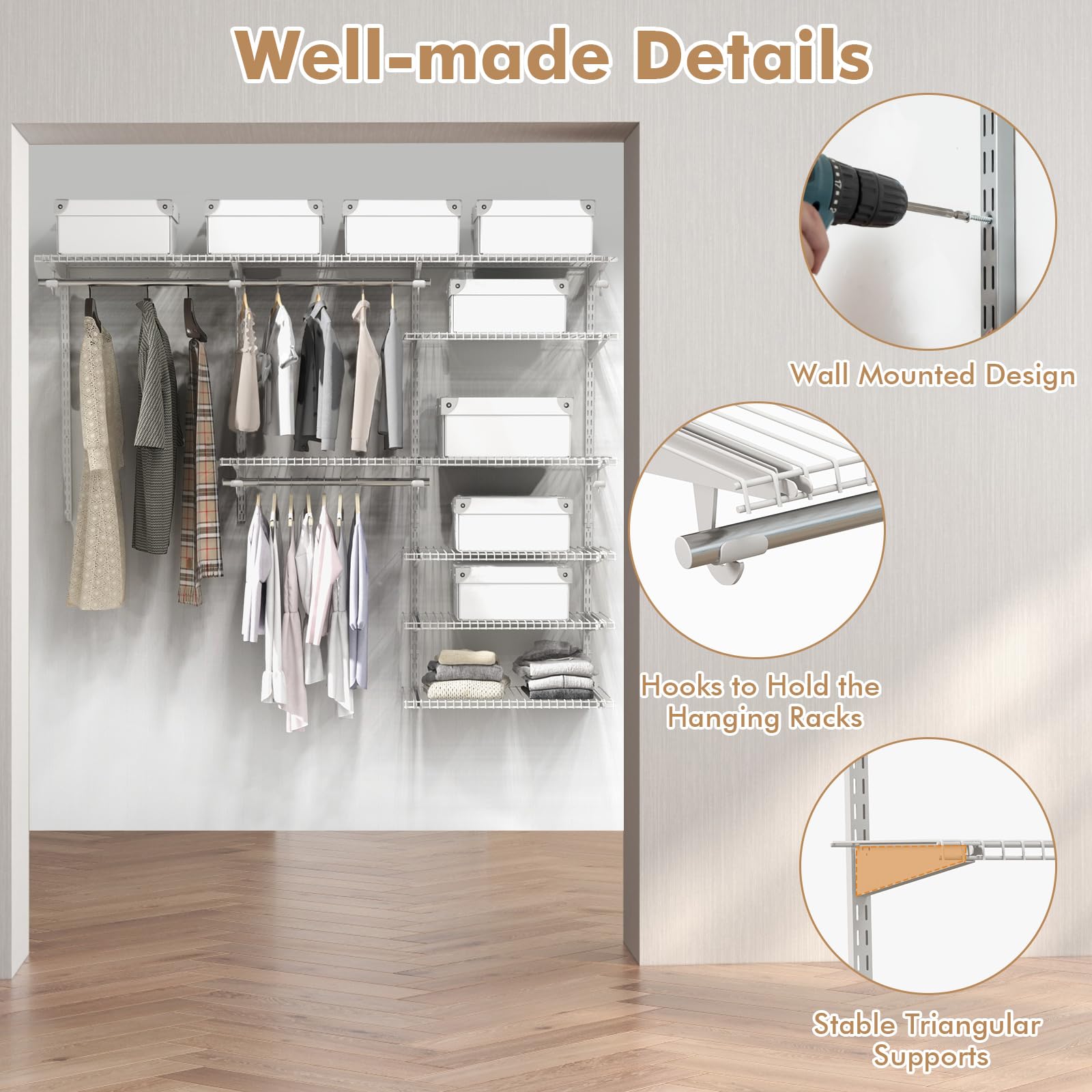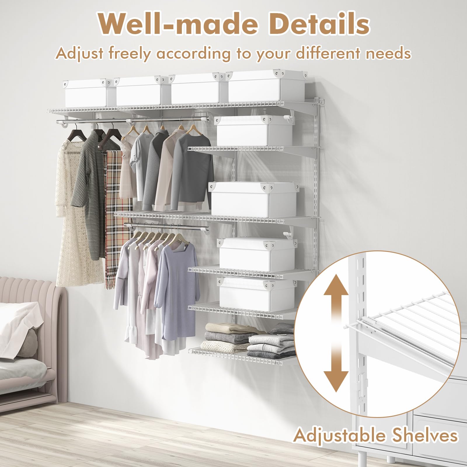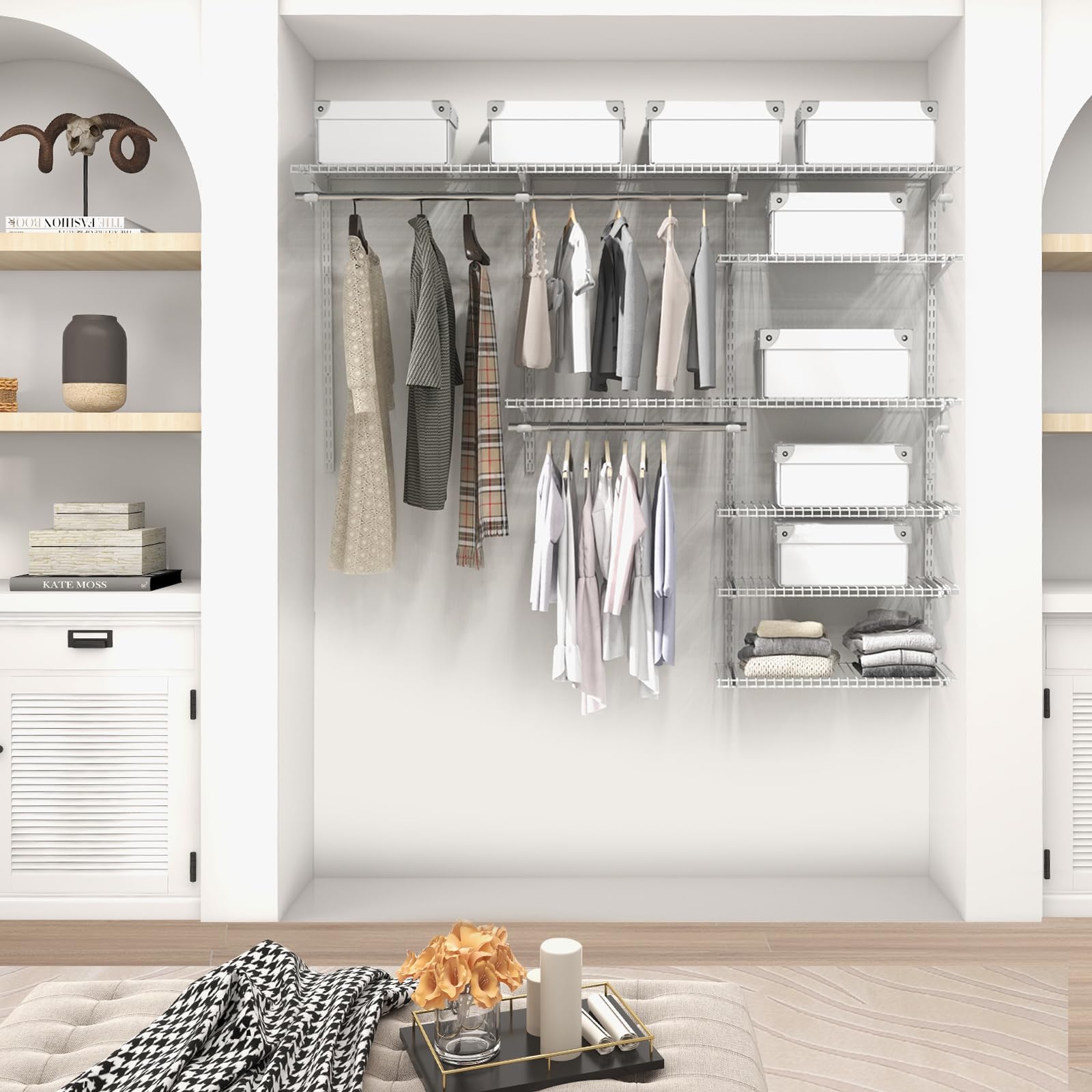 - 【Smart Height Adjustable Shelving】The wire shelving closet kit is a simple and economical solution to organizing your closet and utilizing limited room space. Featuring flexible installation height and vertically/horizontally adjustable mesh shelving/clothing rods, it is convenient for you to change the closet layout according to your storage needs.