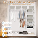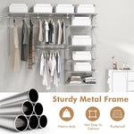 Make the most of your closet space with the adjustable and customizable configurations custom closet kit. These organizers fit closets range from 4ft to 6 ft wide and allows for adjustable shelves so that you can customize to perfection, including 3 sturdy hanging rods, a 5-shelf expanding cubby unit and 4 open shelves provide 75” hanging space and 230” shelving space with full adjustable height. The wire shelves are coated to safeguard against rust or chipping. All necessary hardware and a step-by-step template are included for easy installation. Moreover, you can maximize your storage space by adding other configuration accessories such as wire baskets, Telescopic trousers rack and more.Features
