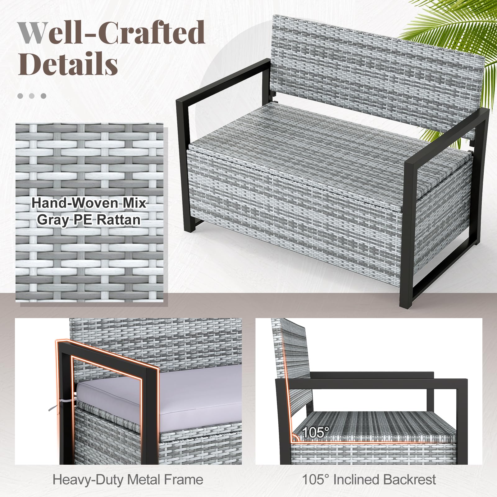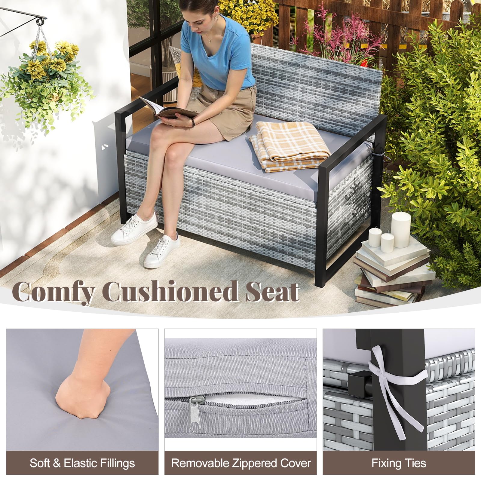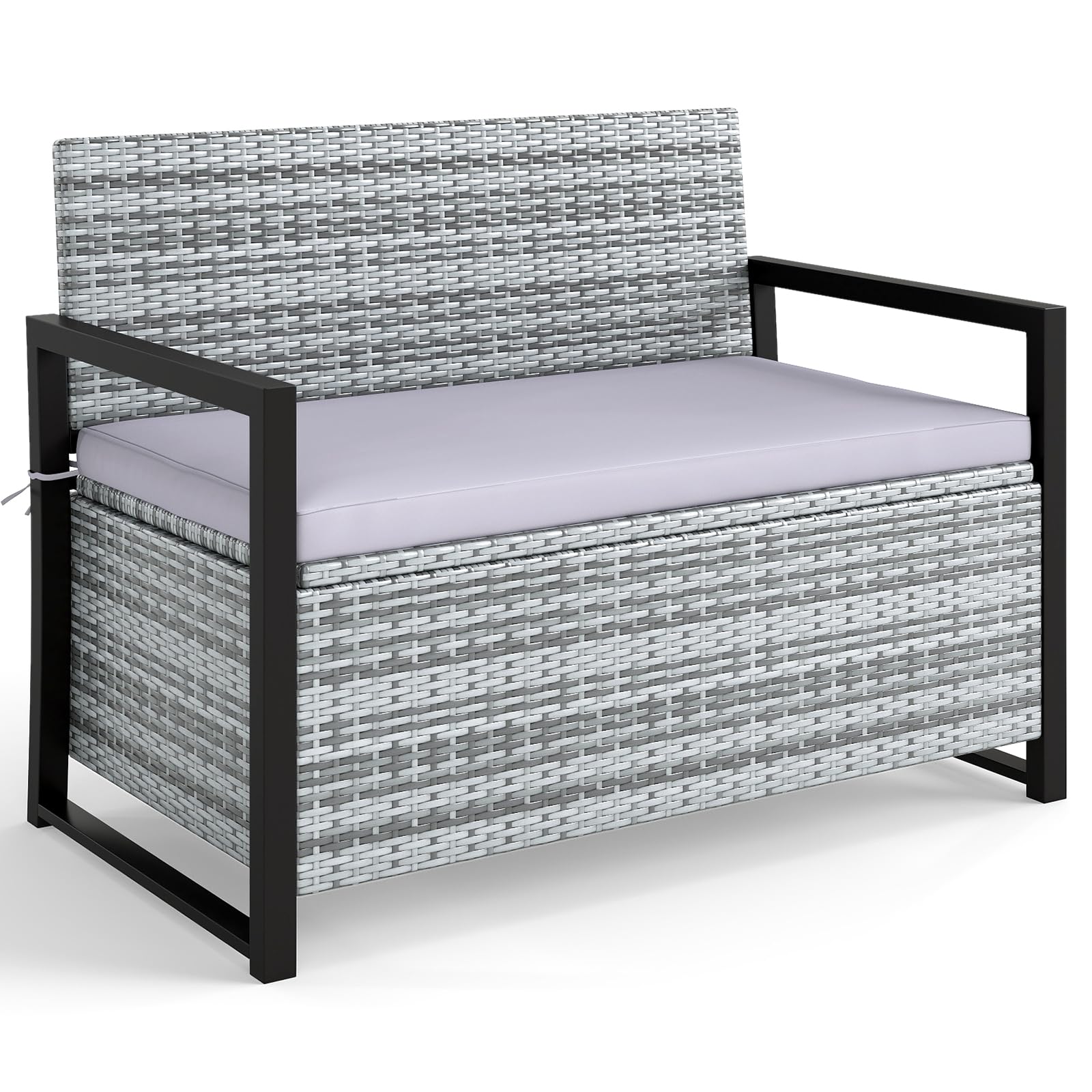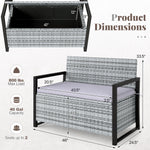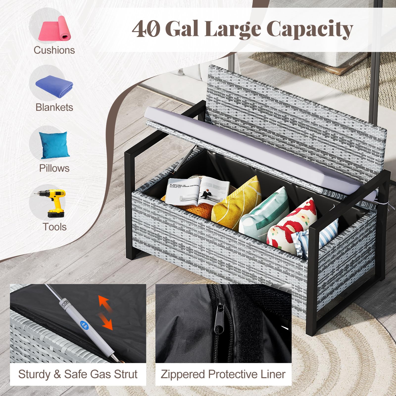 This patio bench is beautifully crafted from hand-woven rattan, offering a rustic appeal while ensuring durability with anti-fading and sunproof qualities. The comfy cushioned seat with inclined backrest will bring you optimal comfort. Below the seat, a 40 gallon storage compartment with a gas strut-supported lid neatly houses your outdoor essentials. Perfect for any patio, this storage bench with well-crafted details elevates functionality without compromising on style, making every outdoor gathering more enjoyable.
