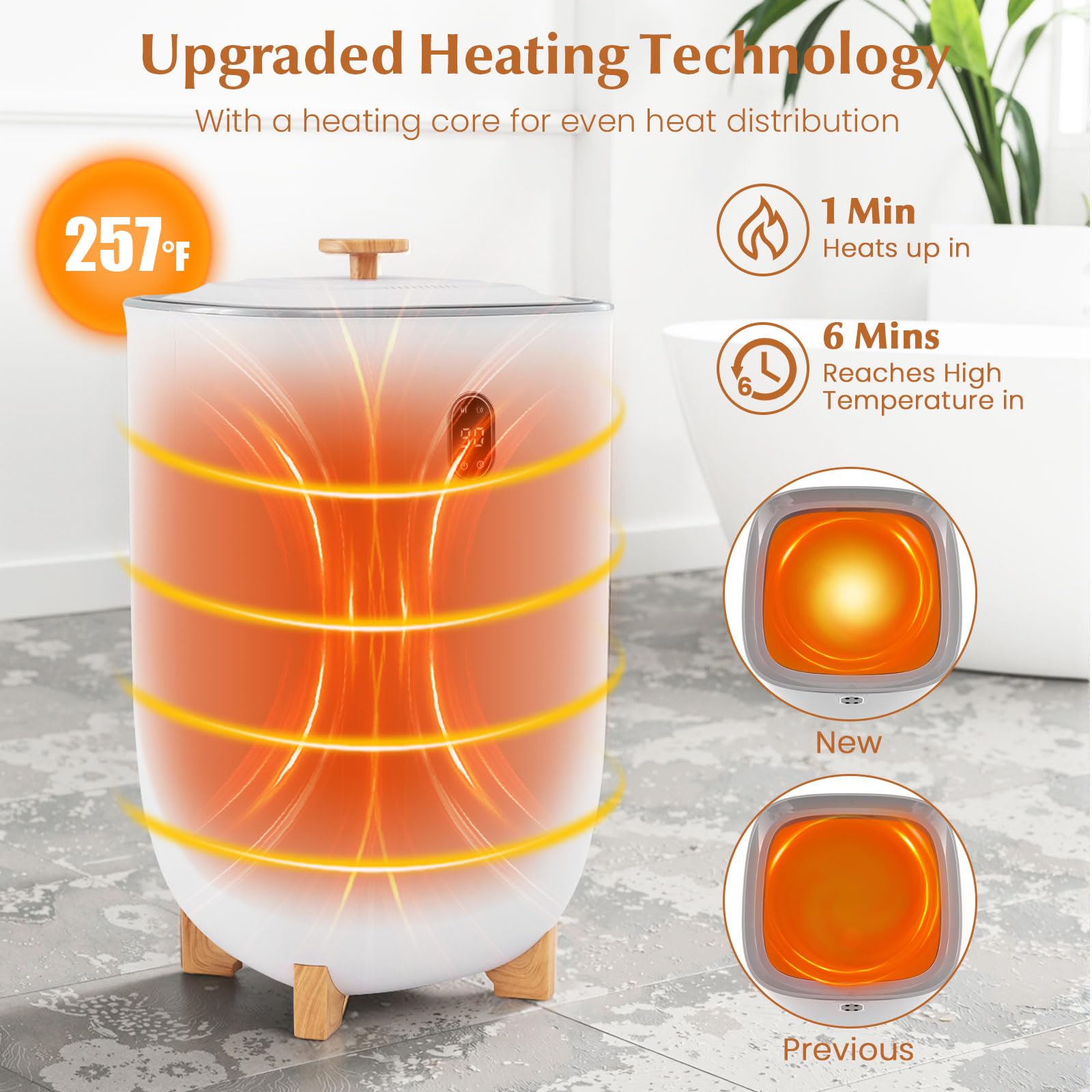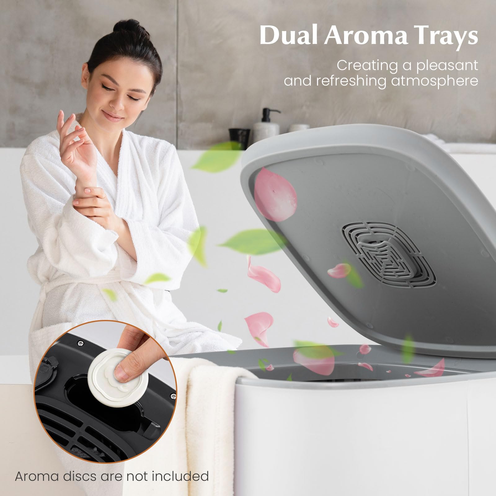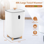 Transform your bathroom into a spa retreat with our luxurious towel warmer! With an upgraded heating mechanism that contributes to fast and even heating, it allows you to indulge in the comfort of warm right after each shower. And the heated bucket can hold 4 large towels, blankets and robes thanks to the substantial 40L capacity, perfect for the whole family or those solo spa days. It is easy to use with a sleek LCD touch panel, allowing you to choose from 2 preset temperatures and 4 timing periods. Enhance the experience with the aroma disc trays that bring calming scents to your bathroom oasis. Perfect as a pampering present or a treat for yourself.