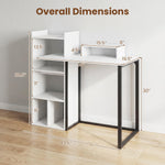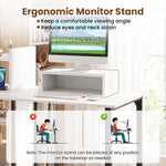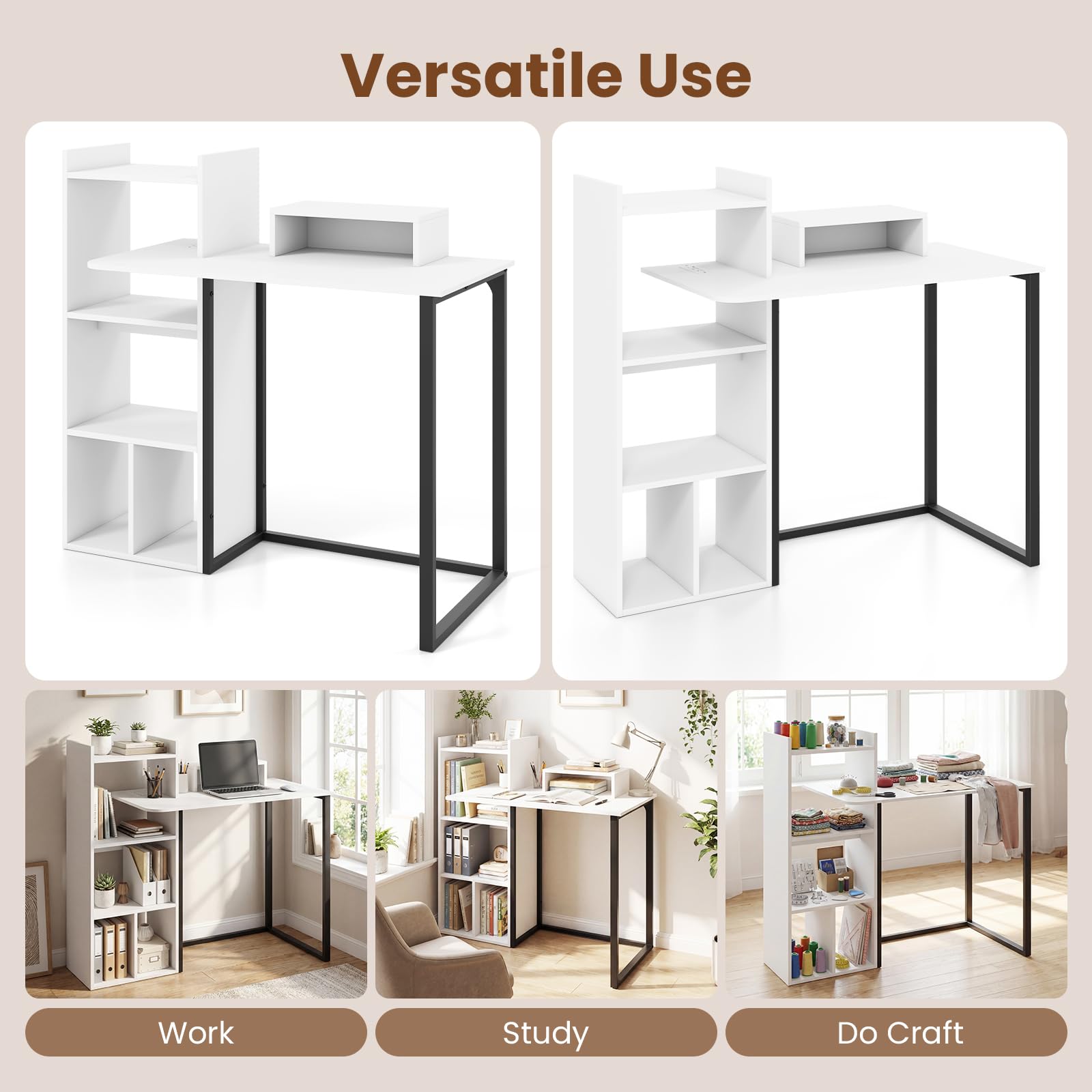 The combination of 2 AC outlets, 1 USB port, and 1 type-C port keeps various devices charged and cables neatly managed. Moreover, the writing desk offers a spacious work surface and includes an ergonomic monitor stand to reduce eyes and neck strain. Multiple open shelves provide convenient storage for essentials. Built with a sturdy metal frame, this corner study desk ensures long-lasting durability. Ideal for working, studying, writing, and gaming, the computer desk optimizes functionality and style in your home.