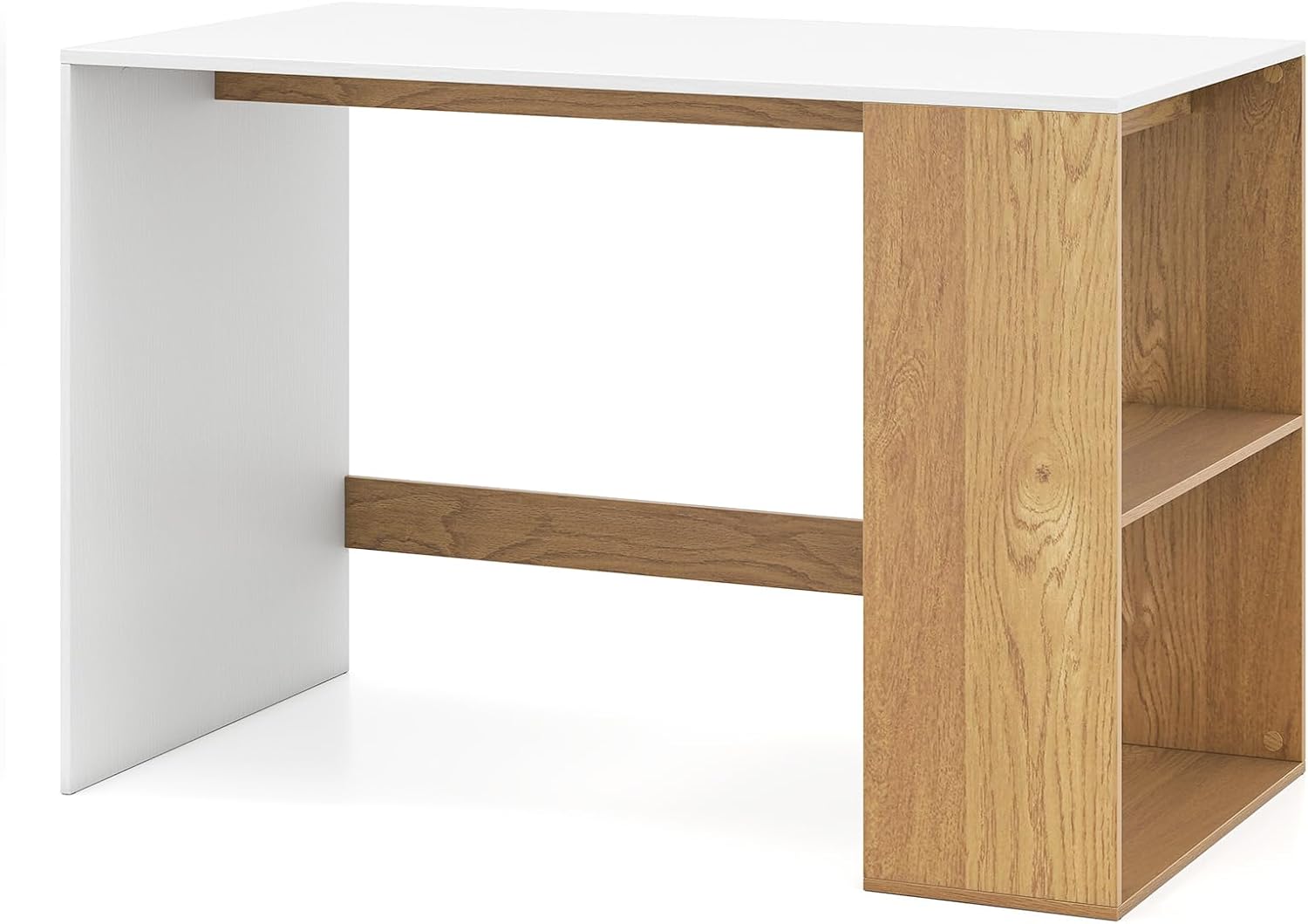 This 44" workstation offers ample surface space, ideal for multitasking and keeping your essentials neatly within reach. Its built-in 2-tier bookshelf provides practical storage for books, documents, and office accessories, helping you stay organized. The home office desk boasts a robust frame reinforced with a crossbar for extra durability, while protective pads shield your floors from scratches. Thoughtfully designed with screw hole covers, it presents a clean and refined finish from every angle. Whether you need a dedicated home office hub, a focused study area, or a chic vanity setup, this versatile piece adapts effortlessly to your lifestyle, blending functionality with elegant design.