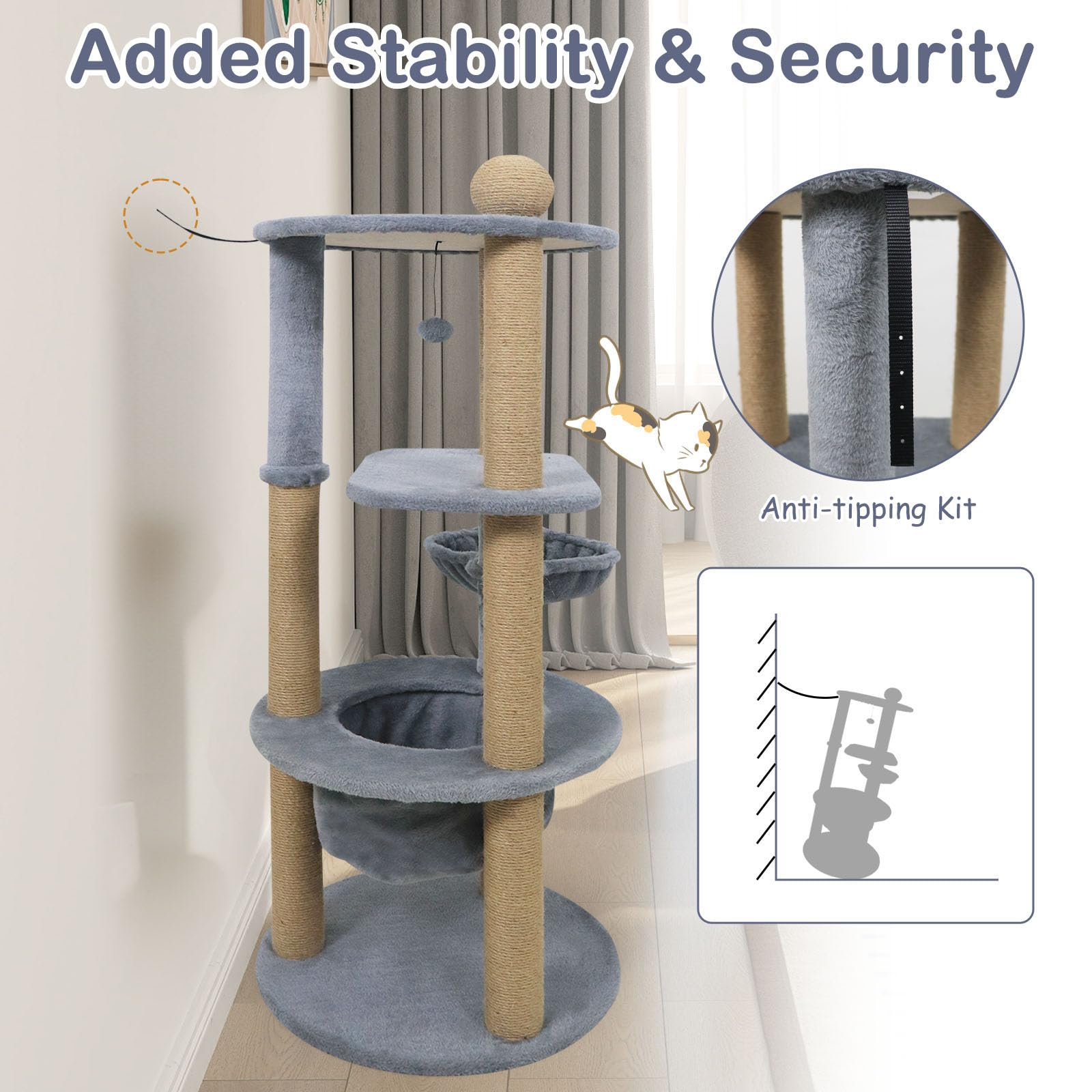 Equipped with 2 spacious platforms positioned at ideal heights, the 47" tall cat tower allows your cat to perch and observe their kingdom. Additionally, the deep hammock provides a snug, enveloping spot where your cat can curl up and feel safe. A rotatable basket bed offers a snug spot for curling up, adding versatility to their napping options. Fully wrapped scratching posts cater to their natural clawing instincts, while a scratcher ball and a dangling plush ball keep playful paws busy and help protect your furniture. For added stability, an adjustable anti-tipping kit is included. Covered with ultra-soft plush fabric, this cat tree combines comfort, security, and entertainment, making it an ideal addition to any cat-loving home.