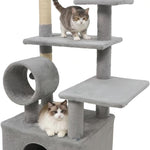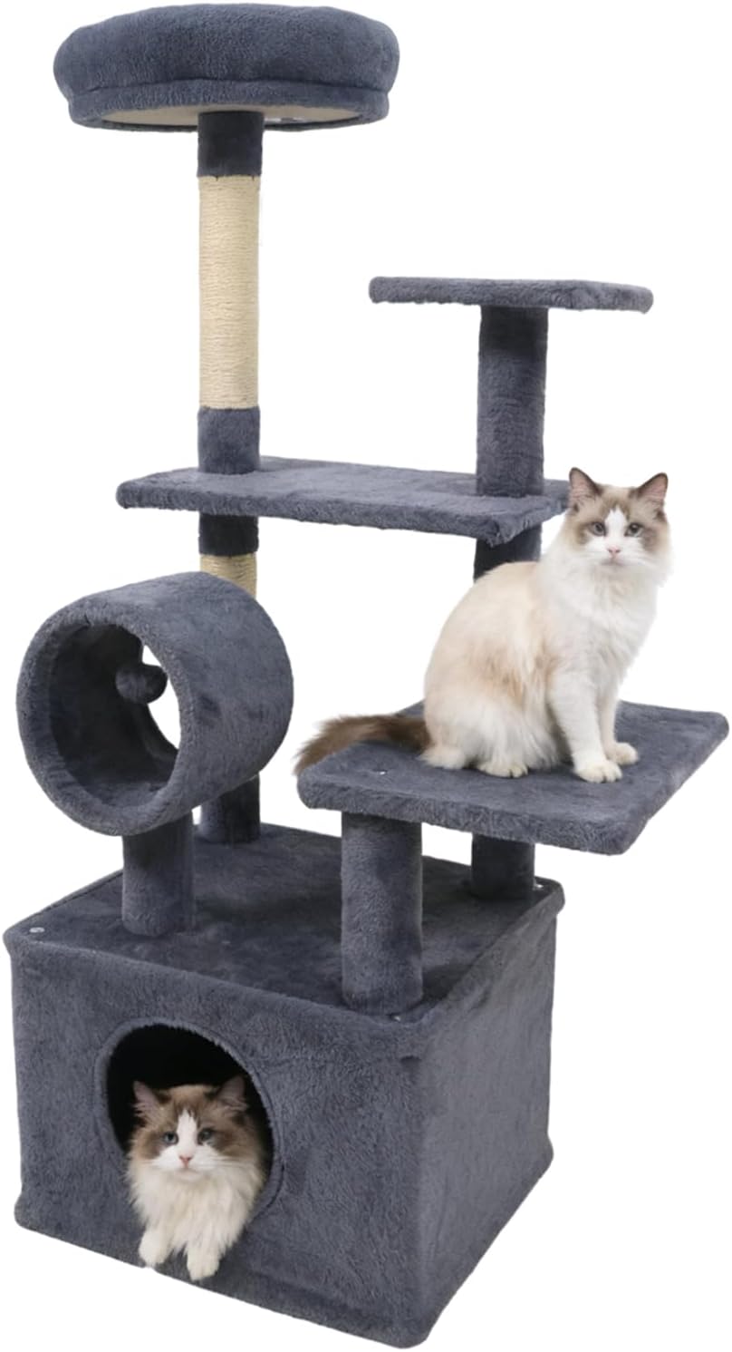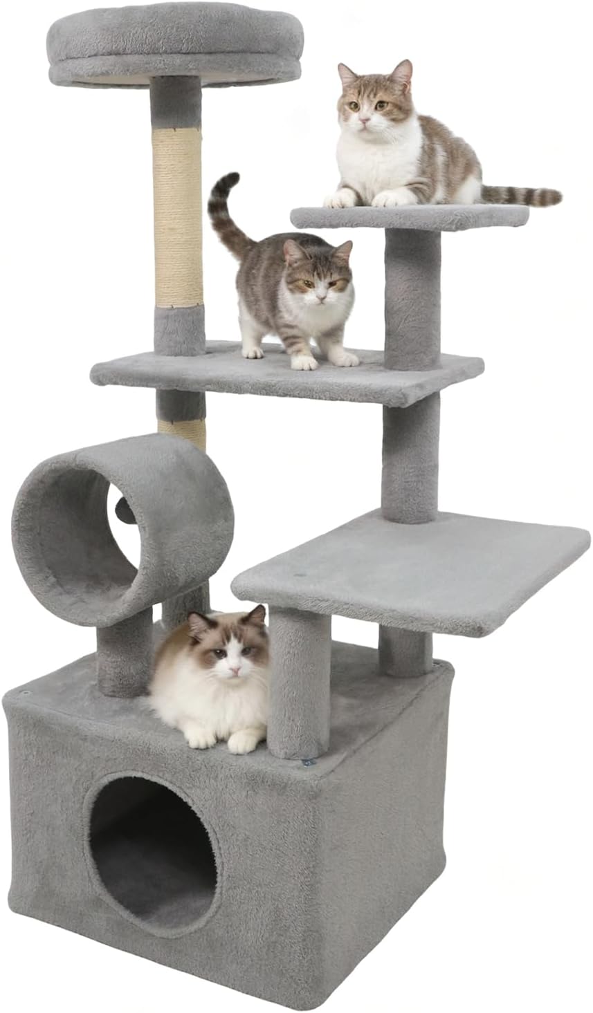 Our 48" tall cat tree tower is designed with a spacious condo and an extra-plush, elevated perch, providing inviting spots for lounging or napping, ensuring your pet always has a cozy retreat. Reliable natural sisal scratching posts help keep claws healthy and satisfy your cat's urge to scratch, protecting your furniture from damage. With a playful tunnel, hanging ball, and multiple sturdy platforms, this cat tree encourages daily exercise and interactive fun. For added security, the anti-toppling device allows you to easily anchor the structure to the wall, making it safe for active climbers. Soft sponge padding and plush fabric coverings throughout ensure a gentle, comfortable touch that your cat will love all day long, making this cat tree a perfect addition to any pet-loving home.