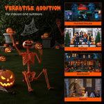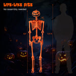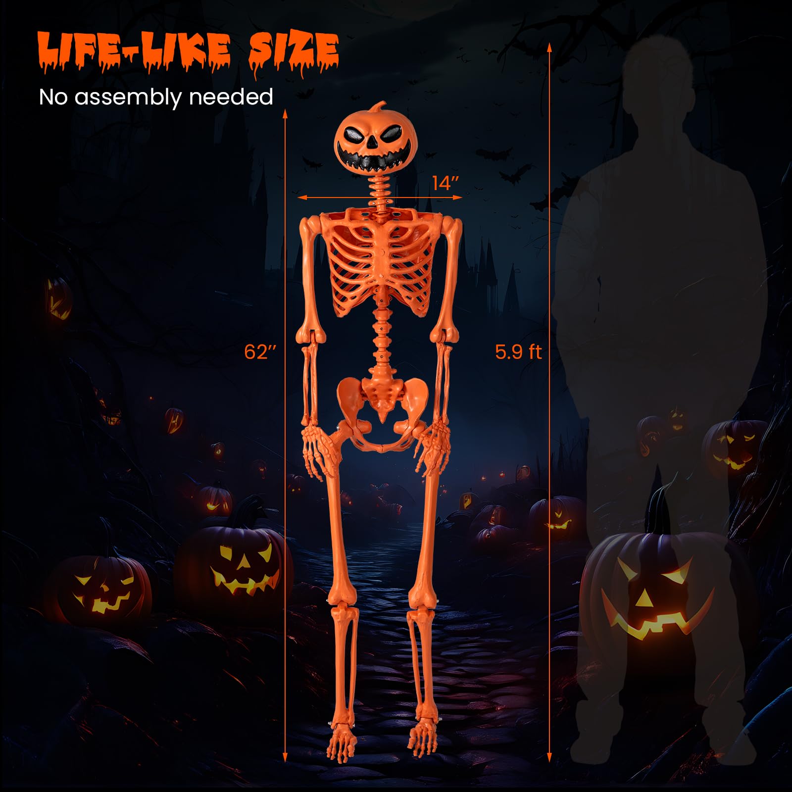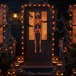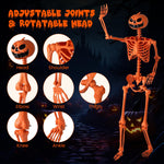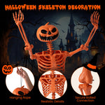 With flexible joints enabling various poses, this pumpkin skeleton is a must-have prop for creating eerie scenes. Arriving fully assembled and a hanging rope for easy setup, this robust skeleton is crafted from high-quality PP and PE materials for long-lasting use. Versatile for indoor or outdoor display, this lifelike decoration adds a bone-chilling touch to your Halloween decoration.