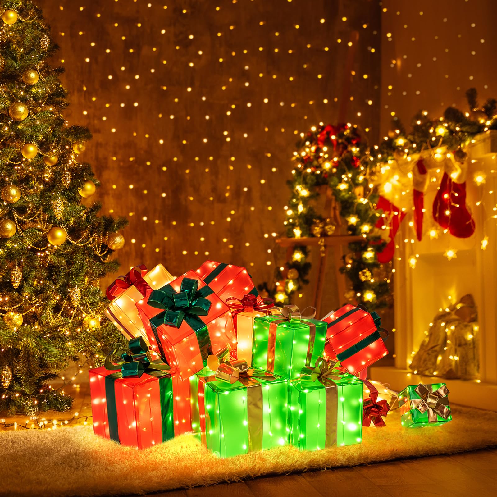 This set of 15 varied-sized boxes can be displayed alone or stacked into a striking 170 cm tower using the included metal pole, creating a captivating festive focal point in any room. Featuring 483 LED light bulbs, these boxes emit a soothing, enchanted glow,and ensure bright elegance all day. With colorful bows, our gift boxes will enhance the holiday spirit. The sturdy construction and easy assembly, with clear instructions and no need for tools, ensure a hassle-free setup and reliable stability. You just need to install pole A to the base, install pole B to pole A, and install the gift boxes. Make your Christmas unforgettable with this charming illuminated decoration.