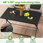 Our 5-piece patio dining set includes a large rectangular dining table and 4 comfortable armchairs, ideal for your indoor and outdoor activities, from patio BBQ and poolside relaxation to balcony tea time and home dining. The quick-fold mechanism adds effortless practicality, allowing you to easily store the set when not in use, ideal for limited space or temporary use. Built to last, the robust metal frame supports significant weight and the anti-slip pads ensure stability and floor protection. The spacious slatted tabletop offers ample room for meals and easy cleanup, making entertaining a breeze. Each chair features breathable mesh fabric, a high back, and wide seats with armrests, ensuring each moment spent around this set is one of comfort and joy. Choose this stylish yet practical dining set to create unforgettable outdoor dining experiences for you and your guests.