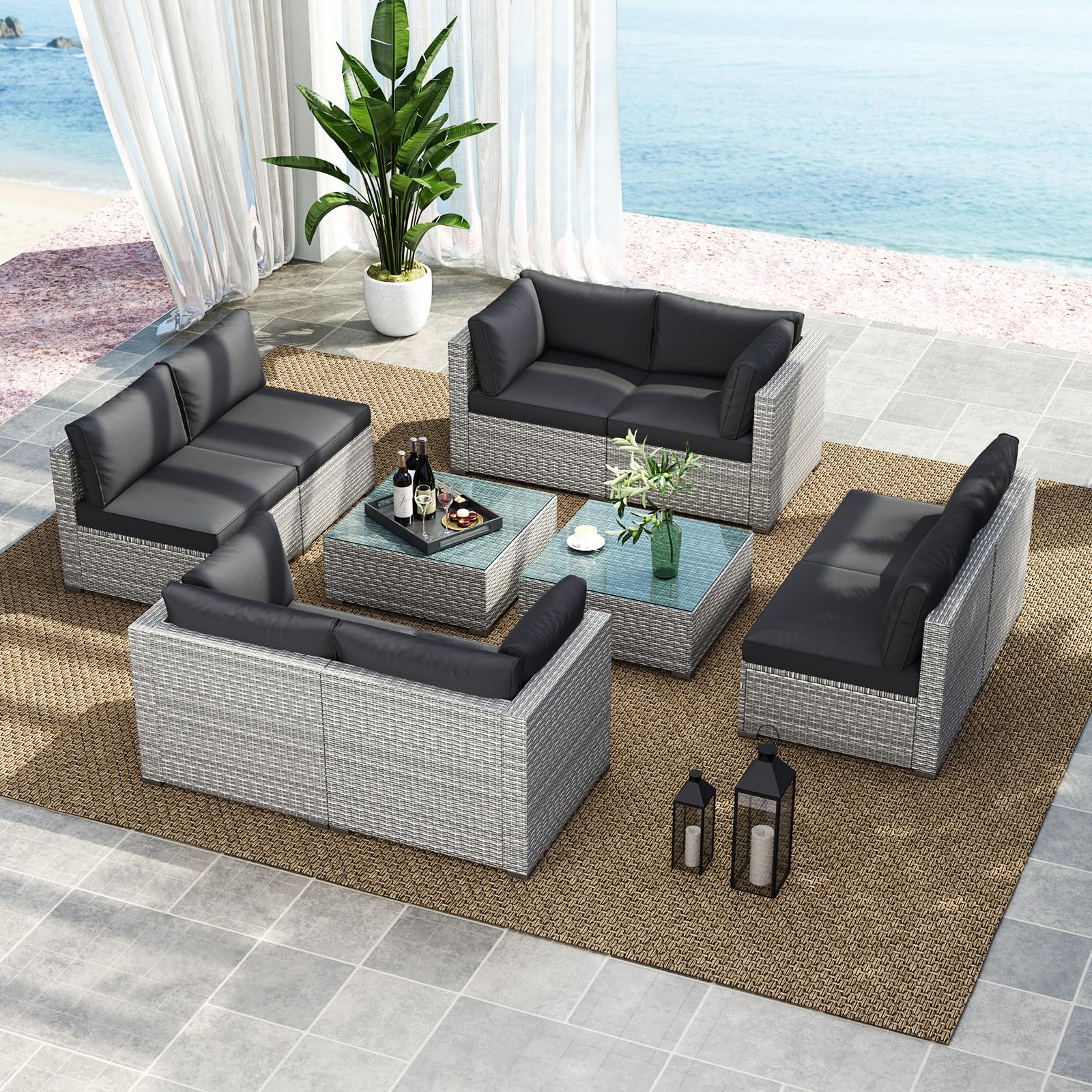 - Premium Materials & Structure: Crafted with PE rattan and a sturdy x-shaped metal frame, this sofa set is designed for durability with crack and fade resistance, ensuring a long lifespan. The coffee table's exquisite tempered glass tabletop adds both strength and elegance to the set.