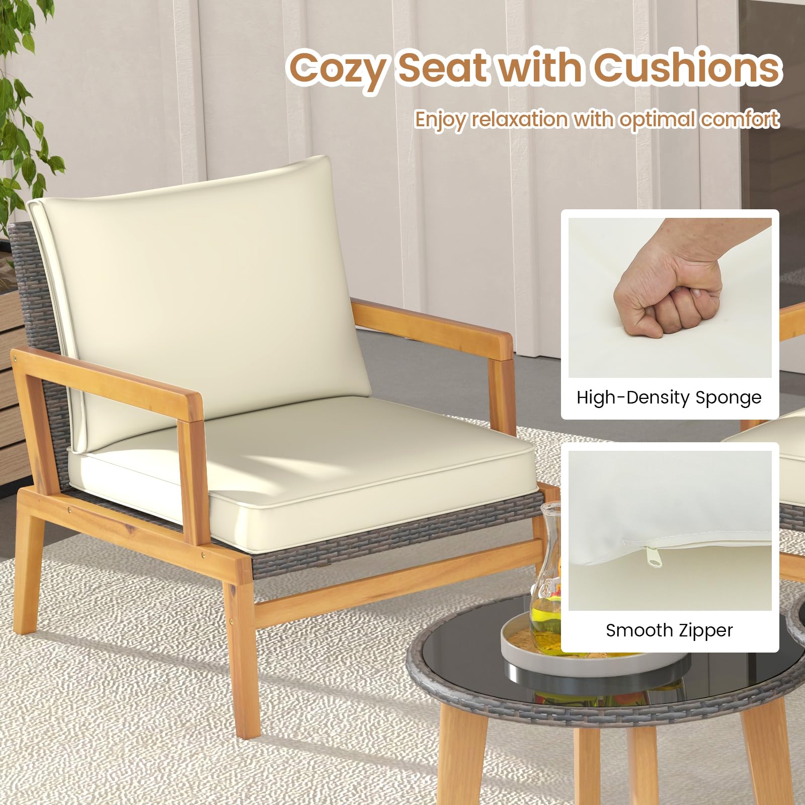 The wide seat with ergonomic backrest and high-density sponge cushions relieve fatigue and provide maximum coziness. And the whole set is made of high-grade material. The mix brown PE rattan is not only elegant but also highly durable and anti-fading. Constructed with premium acacia wood and heavy-duty metal frame, this set is also sturdy and supportive. Furthermore, the two included coffee tables have tempered glass tabletops, and can be arranged in various ways to suit different occasions. Perfect for your backyard, poolside, or balcony, this versatile wicker set adds elegance to any space.