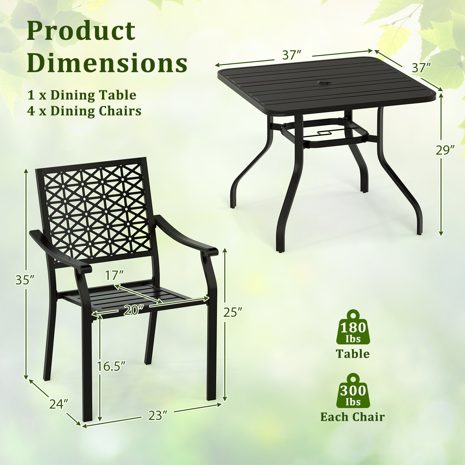 This 5-piece patio dining set upgrades your outdoor space. The large square table, measuring 37", provides ample space for family meals. Its umbrella hole and metal bracket allow easy attachment of a shading umbrella (not included). Additionally, the heavy-duty metal frame with e-coating and powder coating offers top-notch rust resistance. Adjustable foot pads ensure stability on uneven ground. The 4 armchairs feature breathable backrests and wide slatted seats for comfort during long outdoor sessions. The smooth curved armrests add extra comfort. Besides, designed for practicality, the armchairs stack easily when not in use, saving storage space. Perfect for patios, backyards, poolside, or gardens, this versatile furniture set remains a stylish addition to any outdoor setting.
