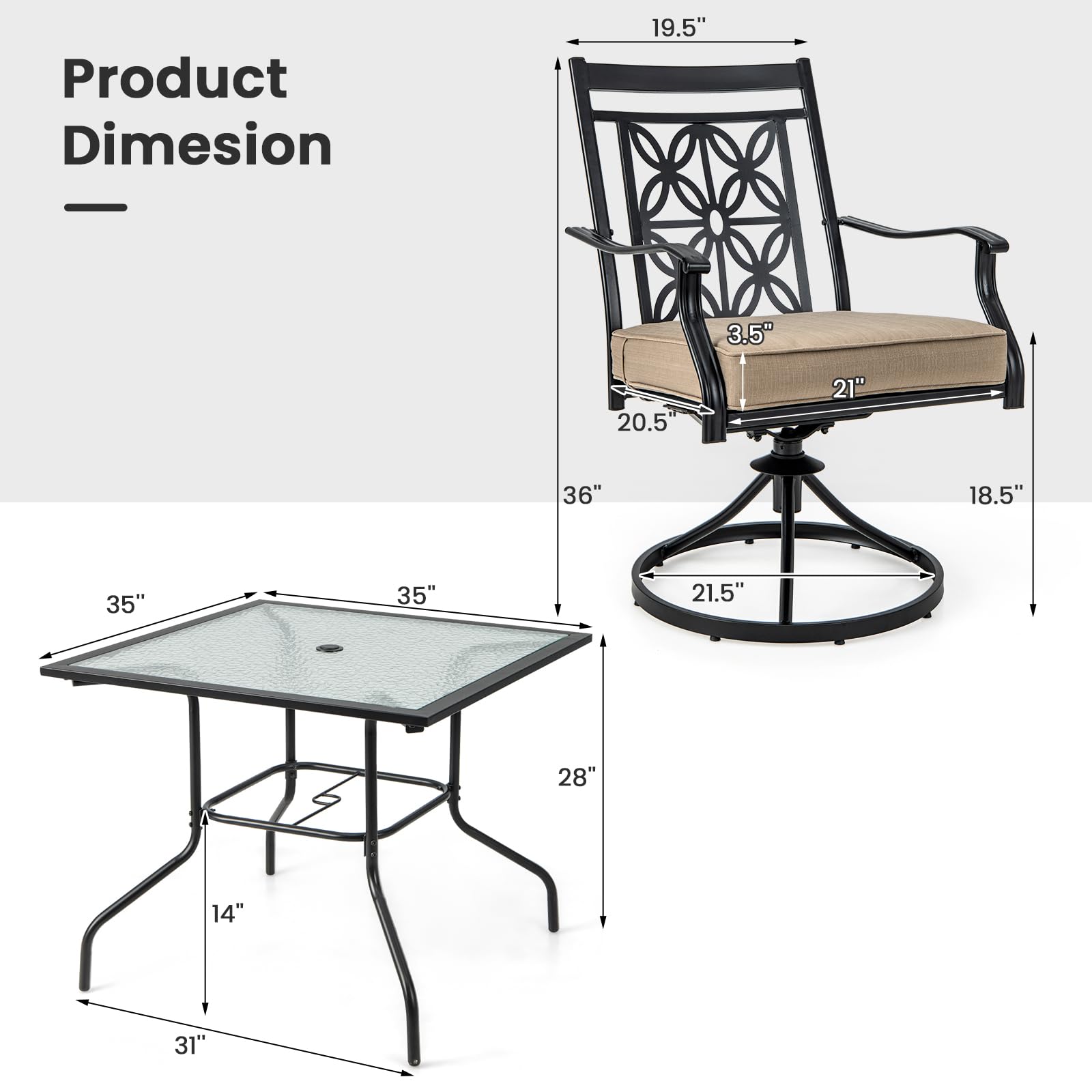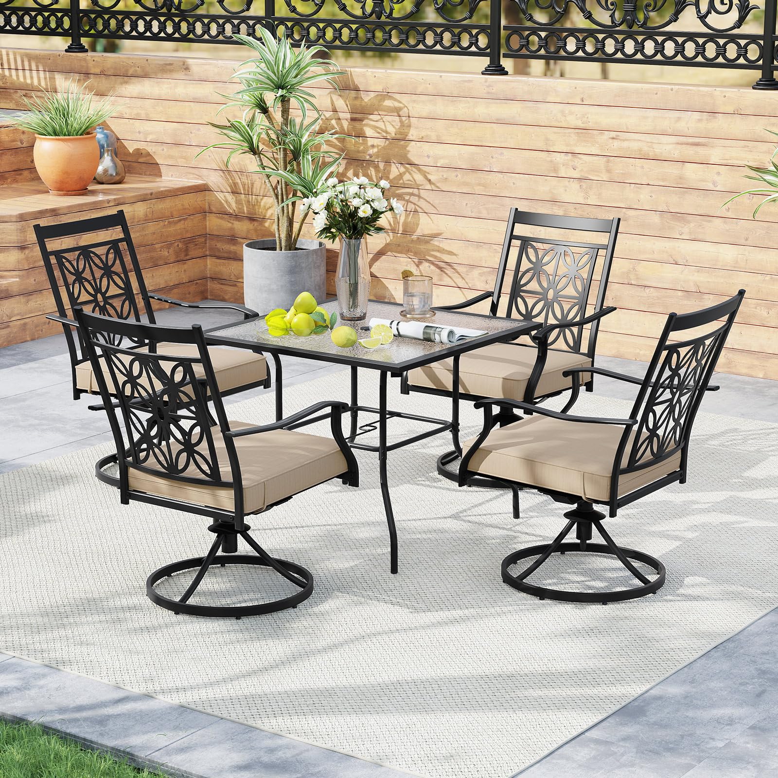 This patio set features a square bistro table with a tempered glass top and a convenient 1.5” umbrella hole, perfect for outdoor enjoyment. The 4 swivel patio chairs with robust metal construction adorned with exquisite floral patterns, ensure stability and visual charm. Each chair offers 360° swivel functionality for dynamic seating and interaction. Designed for maximum comfort, the patio armchairs boast contoured backrests, curved armrests and thick cushions with fixing ties to keep them securely in place.