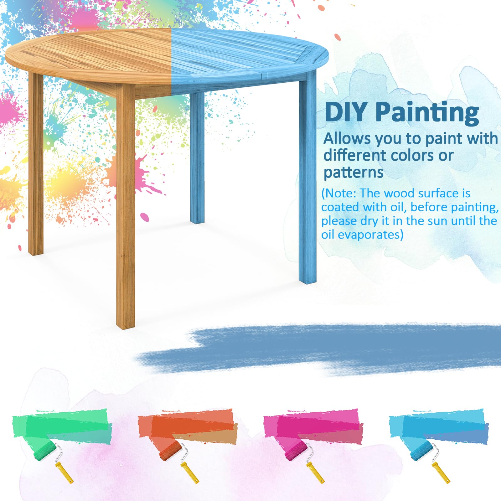 Adds a touch of elegance and functionality to your outdoor space with this 5-piece patio dining set! These 4 patio dining chairs are made of colorfast and sun-protective PE wicker, showing you higher durability in the outdoor environment. And 4 soft padded cushions are included to provide you with a comfy sitting experience. As for the round dining table, the acacia wood material not only ensures strong stability, but also inspires you to paint for free DIY. This 5-piece patio table and chairs set is perfect for enjoying meals with family and friends on your patio, backyard, poolside or garden.