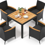 Enhance your outdoor dining experience with the rattan patio dining table set. The practical outdoor table boasts a sturdy acacia wood tabletop that can be preserved with wood-specific wax oil maintenance. Enjoy a large sun shade with the built-in umbrella hole, designed with a 1.97” diameter. Crafted with an elegant PE rattan exterior, this patio conversation set hides a reinforced metal frame, while ensuring a robust design that can support up to 165 lbs on the table and 400 lbs on each chair. Experience ultimate seating comfort with detachable seat cushions made of non-woven fabric and sponge, complete with zippered covers for easy cleaning. The patio dining set is incredibly versatile, adapting to any type of flooring with adjustable and anti-slip foot pads for added stability. With its inclined backrest and armrests, each dining chair offers maximum relaxation.