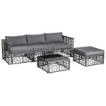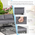 Enjoy the sunshine outdoors with this 5-piece patio furniture set! Based on your selected place, you can customize this outdoor conversation set into a suitable shape. After that, the soft padded cushions are ready for you to sit on, providing you with extraordinary comfort. Furthermore, the cushioned ottoman not only relaxes your feet but also plays its role as an extra seat. And the tempered glass coffee table is the perfect choice to place different items. What's more, regardless of rain and sun, this outdoor sectional sofa set will remain high quality as always thanks to the all-weather PE rattan and rustproof steel frame.