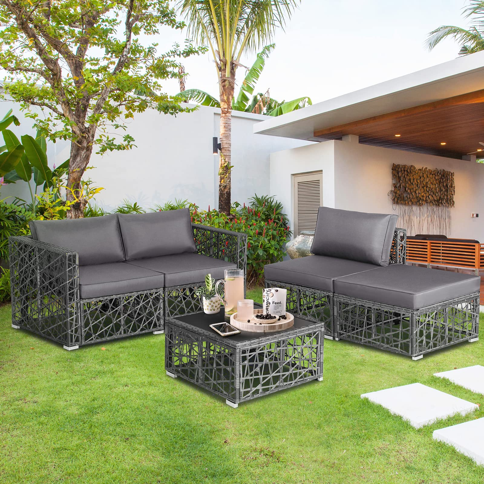 - Modular Sectional Sofa Set: It is the perfect choice to place this patio furniture set in your garden, poolside, or backyard. And according to your available space, you can rearrange this 5-piece patio set into various combinations. In addition, the 4 fastener clips will keep each sofa well connected.