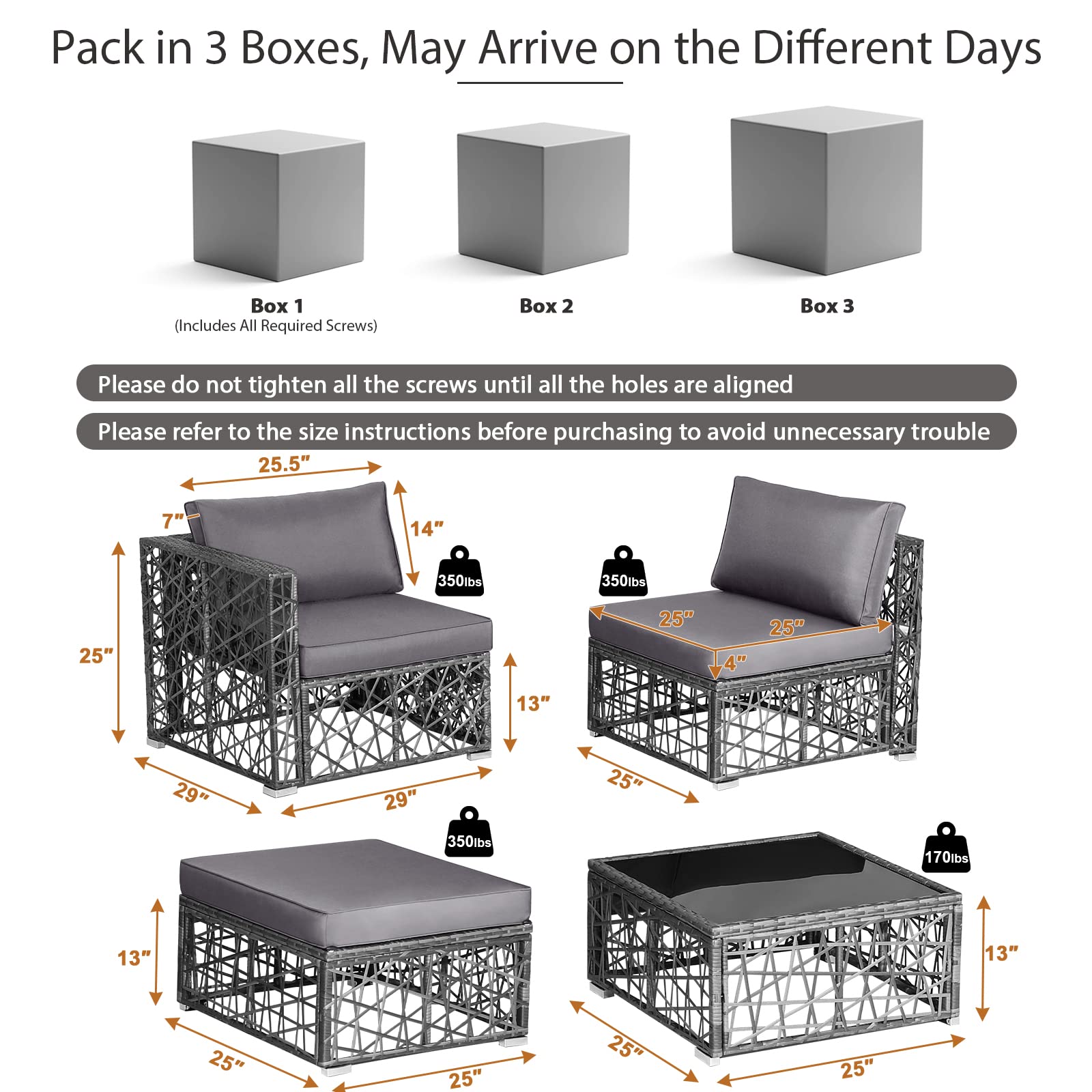 - Shipping Information: This 5-piece outdoor furniture set is packed in 3 boxes that may arrive on different days. And box 1 includes all required screws. Please install it after receiving all packages. During assembling, please do not tighten all the screws until all the holes are aligned.