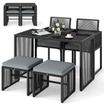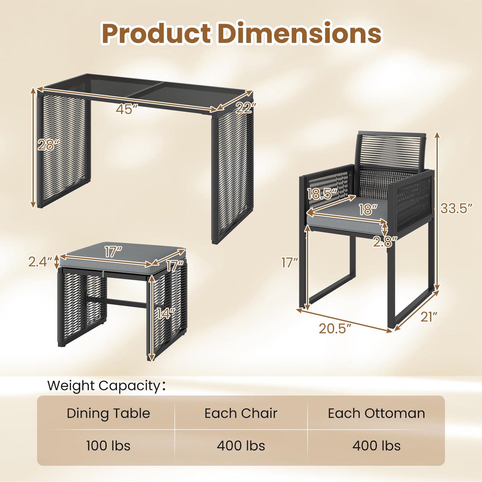 Create unforgettable moments under the sun or stars with our 5-piece patio conversation set. The outdoor patio furniture set includes 2 armchairs with soft, removable cushions and 2 robust ottomans that can also serve as additional seating, each supporting up to 400 lbs. Space is never an issue as the innovative design allows you to tuck the ottomans under the chairs and fold the backrests to slide everything neatly under the sleek, tempered glass table. Each piece of this patio bistro set is crafted with hand-woven, round PE wicker, ensuring sun protection and fade resistance, making this patio set an ideal choice for sprucing up your garden, backyard or poolside.